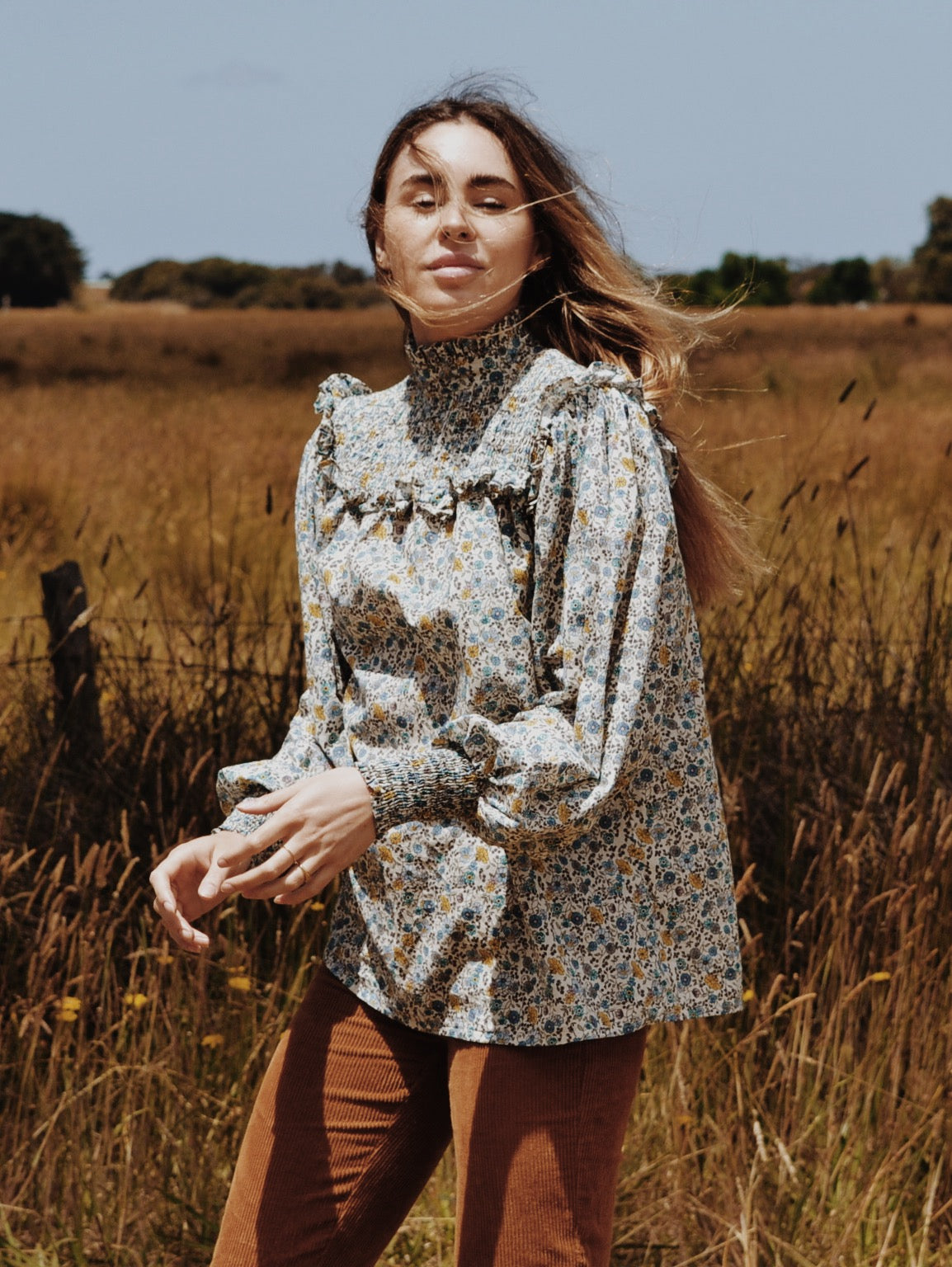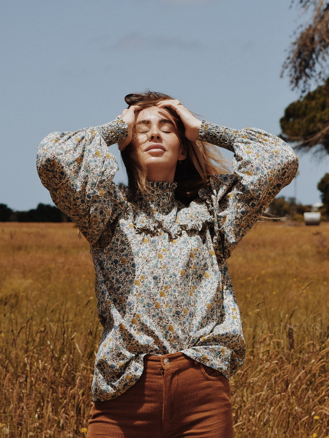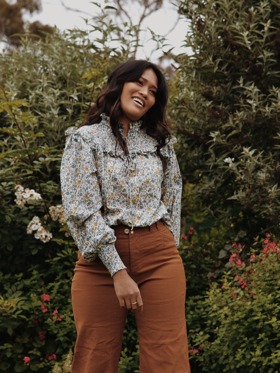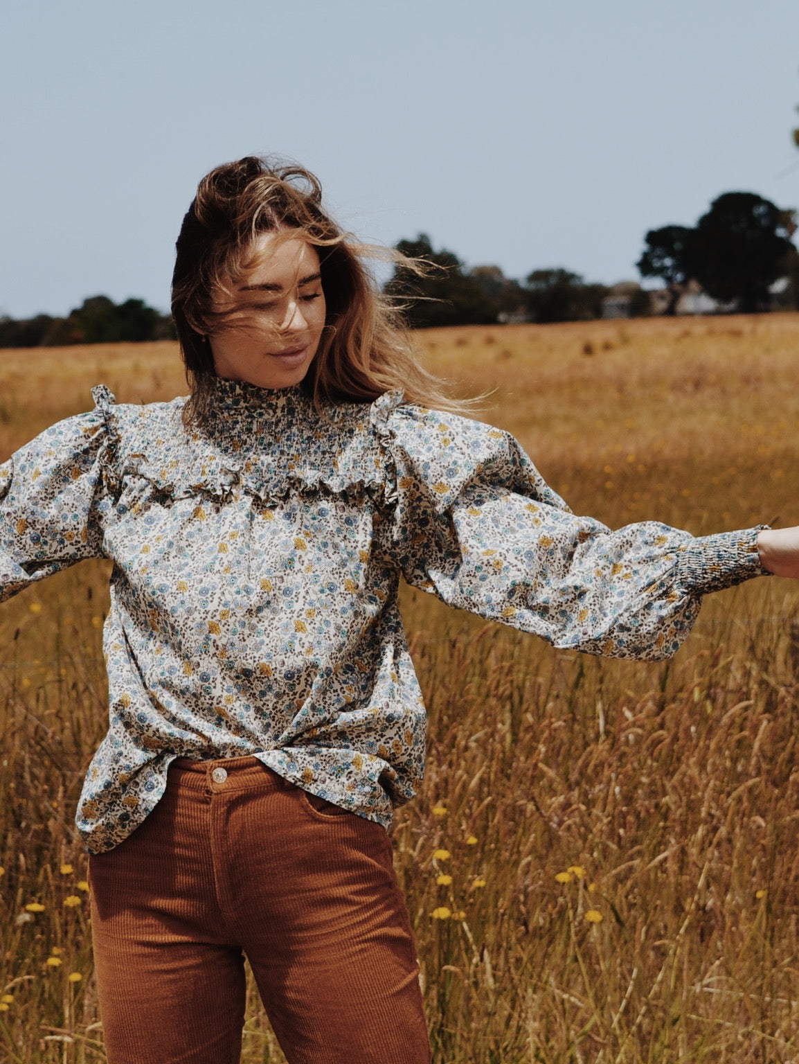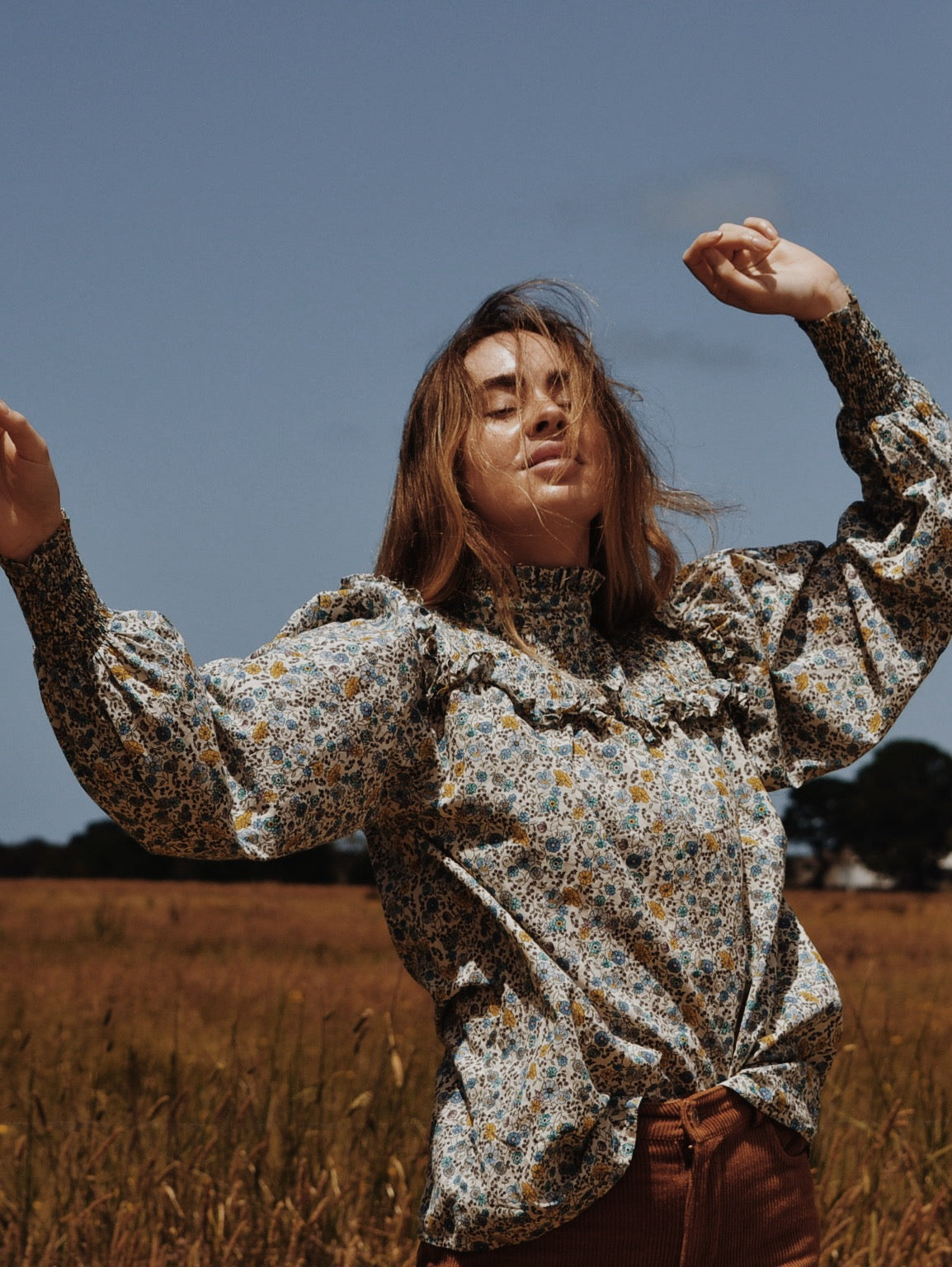 A blouse made for light and carefree days spent slowly outside in the garden. Modernised Edwardian, a beautifully floaty style that can be worn casually with your favourite jeans, or also has a slightly dressier edge in it's frill detailing. The shirred yoke can be worn open casually or as a high neck, making it also ideal for feeding. To get the ultimate wear out of your blouse, you can also flip in around to a closed high neck look too as seen in photos.
