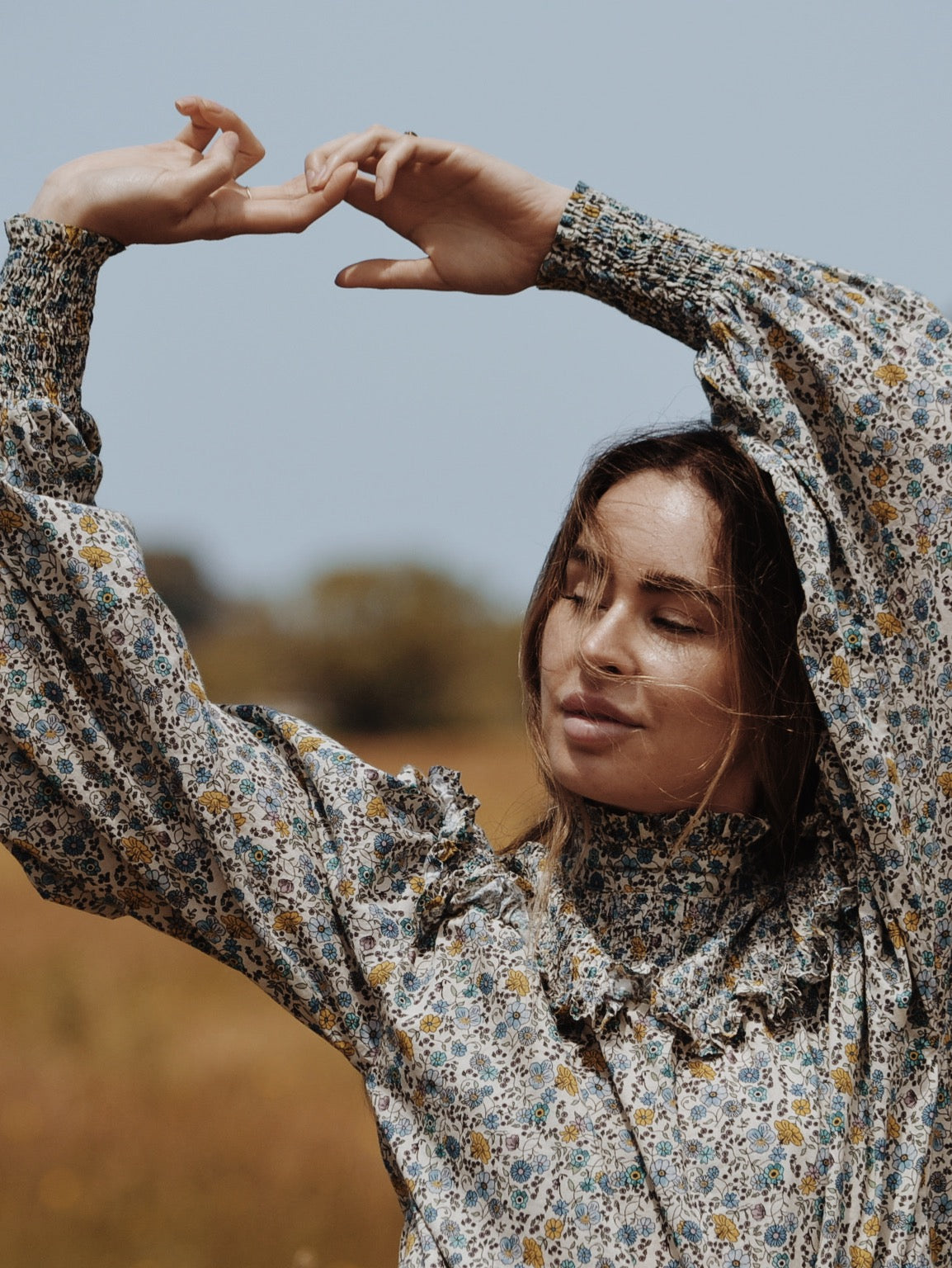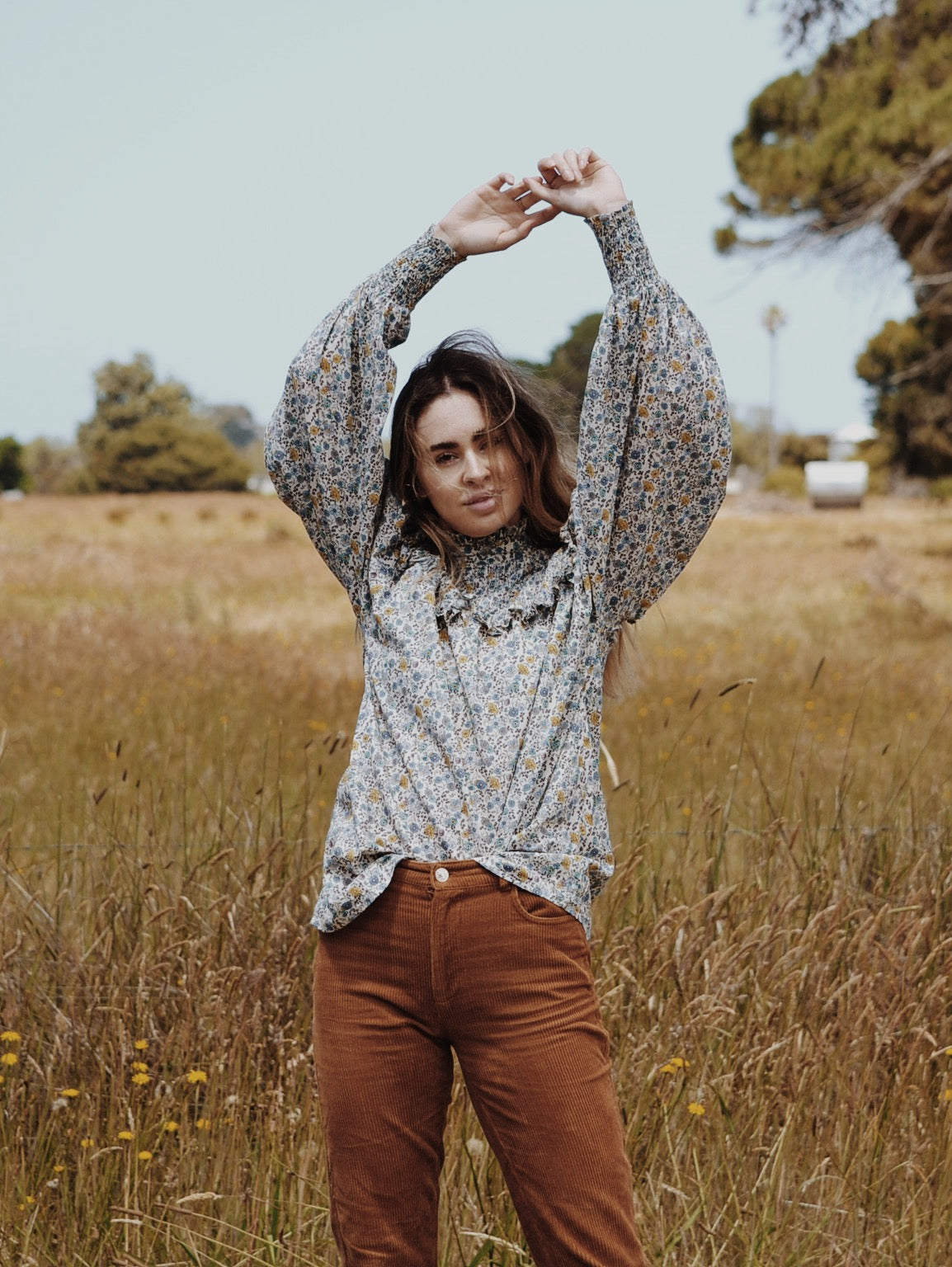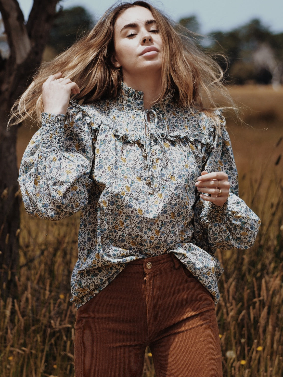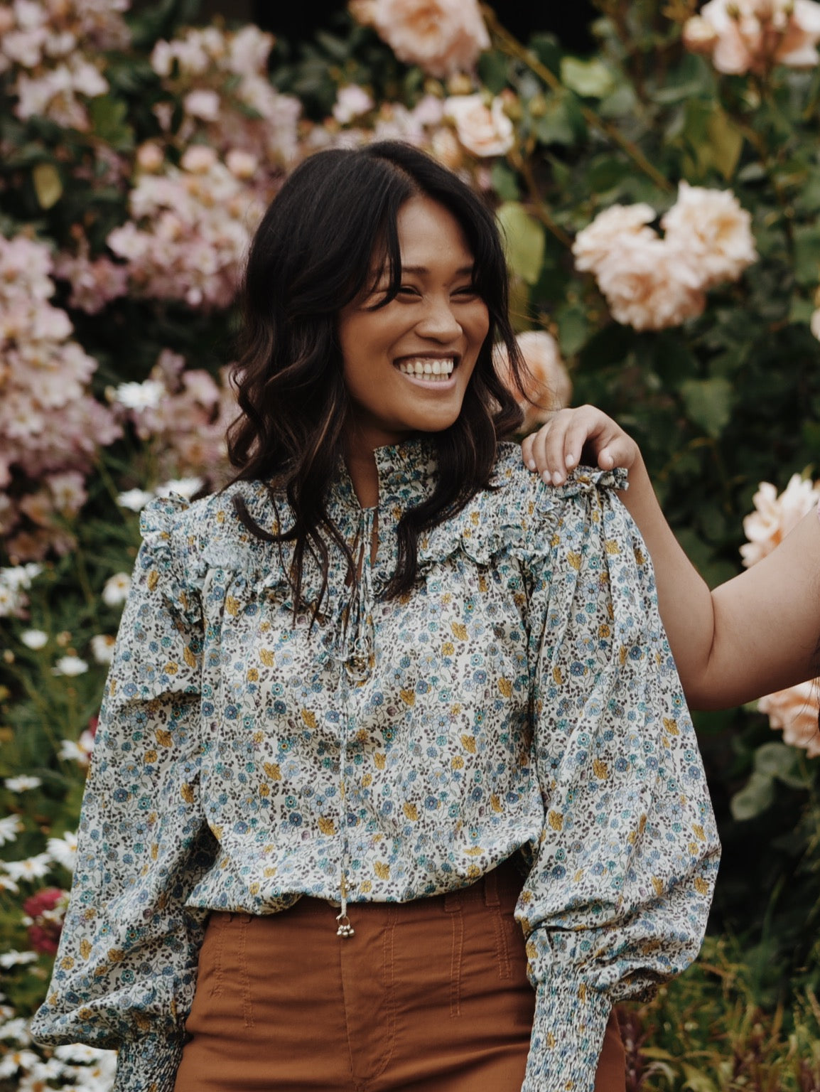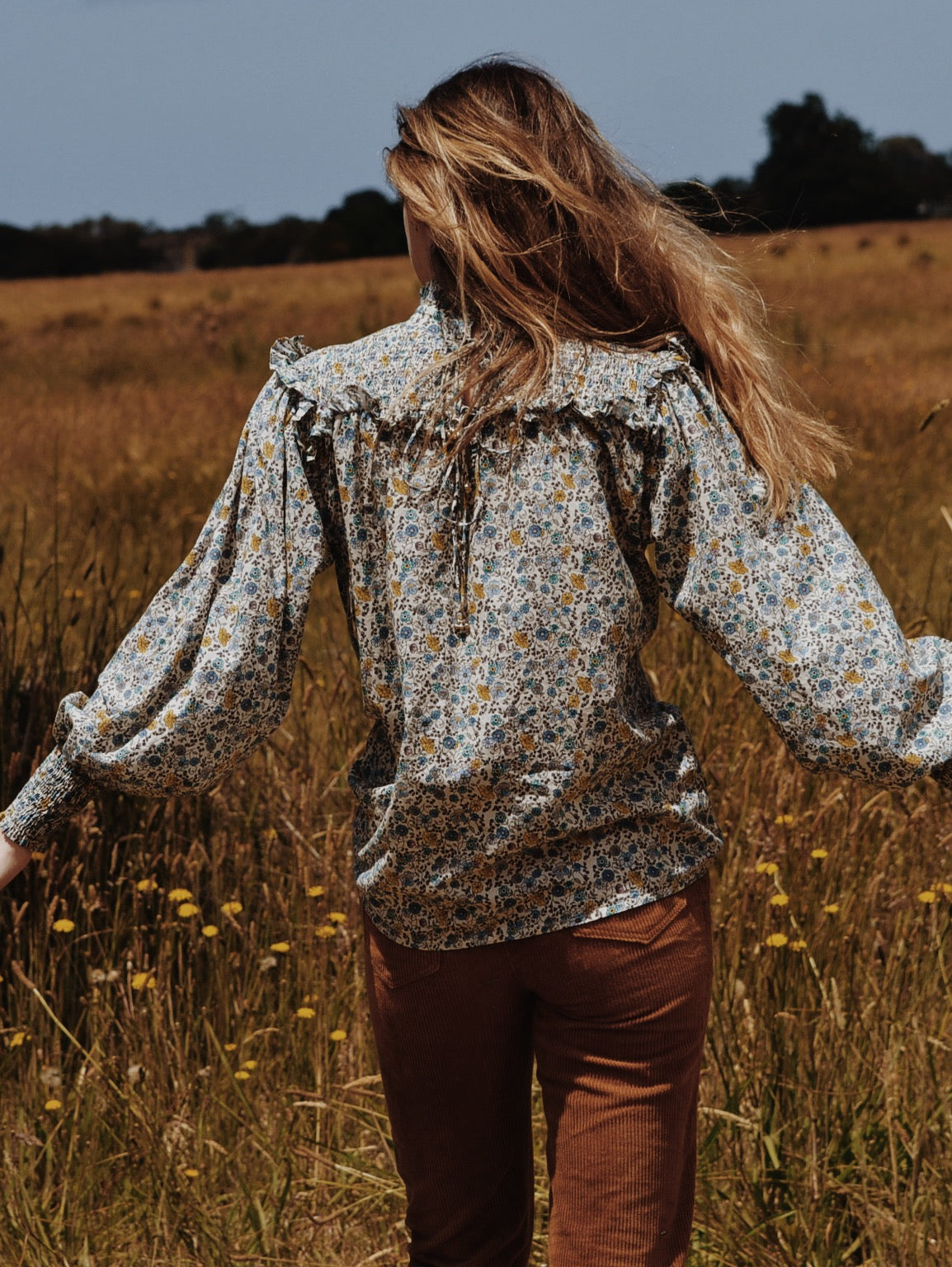 A blouse made for light and carefree days spent slowly outside in the garden. Modernised Edwardian, a beautifully floaty style that can be worn casually with your favourite jeans, or also has a slightly dressier edge in it's frill detailing. The shirred yoke can be worn open casually or as a high neck, making it also ideal for feeding. To get the ultimate wear out of your blouse, you can also flip in around to a closed high neck look too as seen in photos.