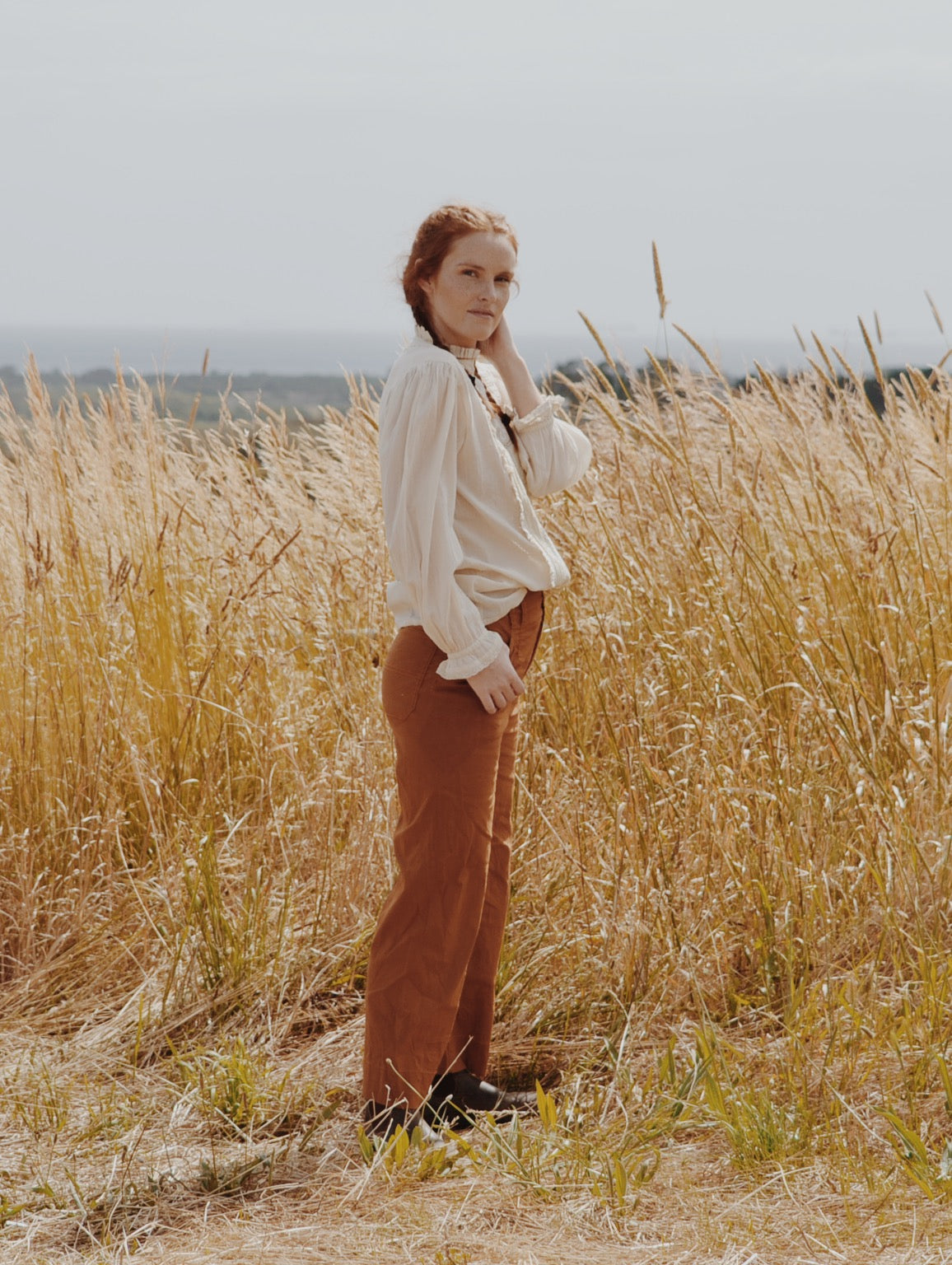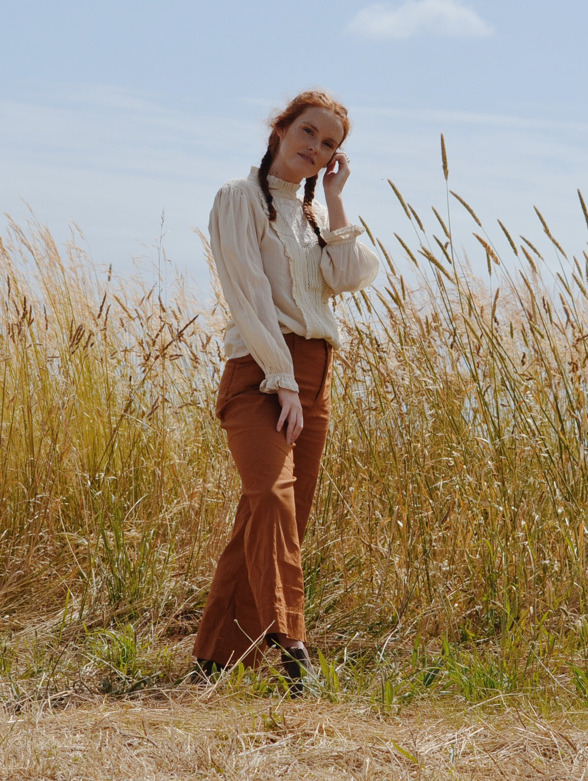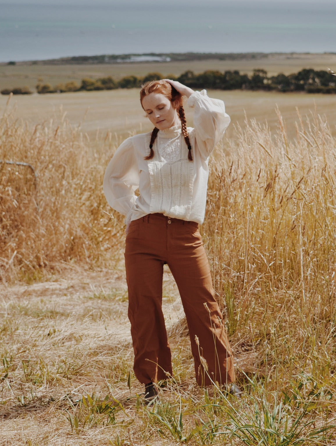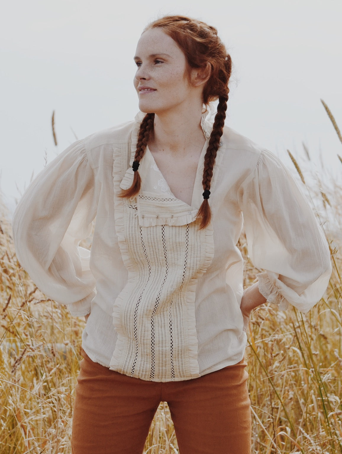 A classic blouse you will treasure, made for slow days spent wandering in a reverie. This beauty will take you to a time and place far away. Little nods to nostalgia include the Edwardian inspired high neckline with gathers, lace detailing, pin tucks and a beautiful embroidered feature.