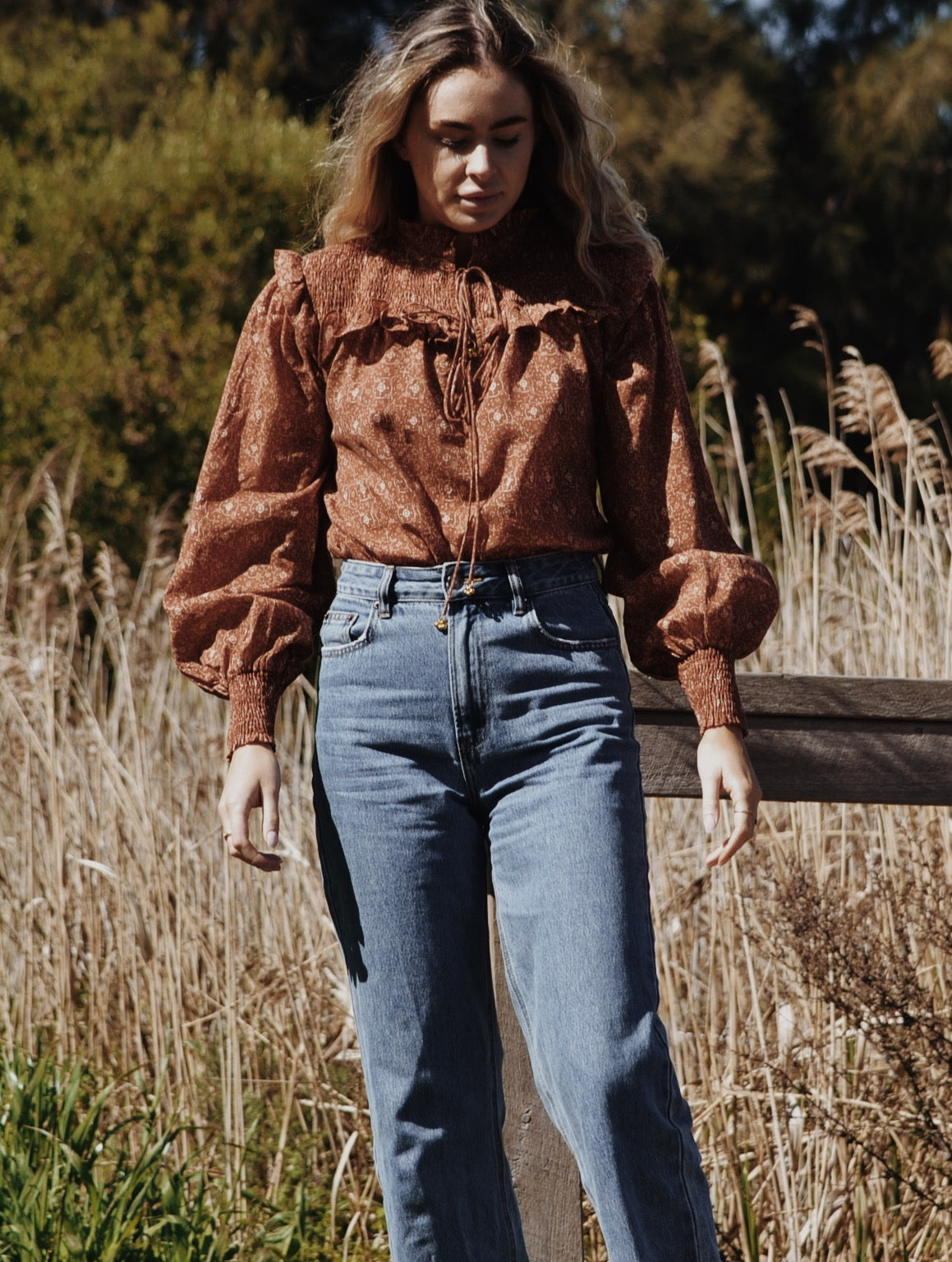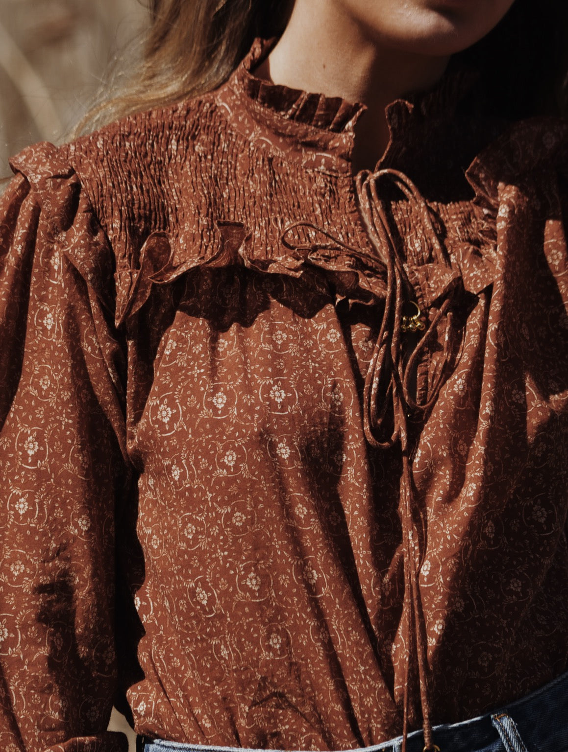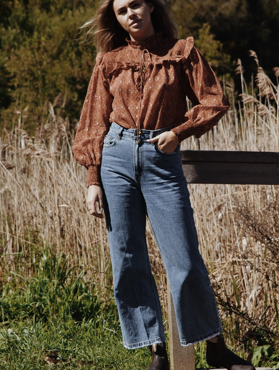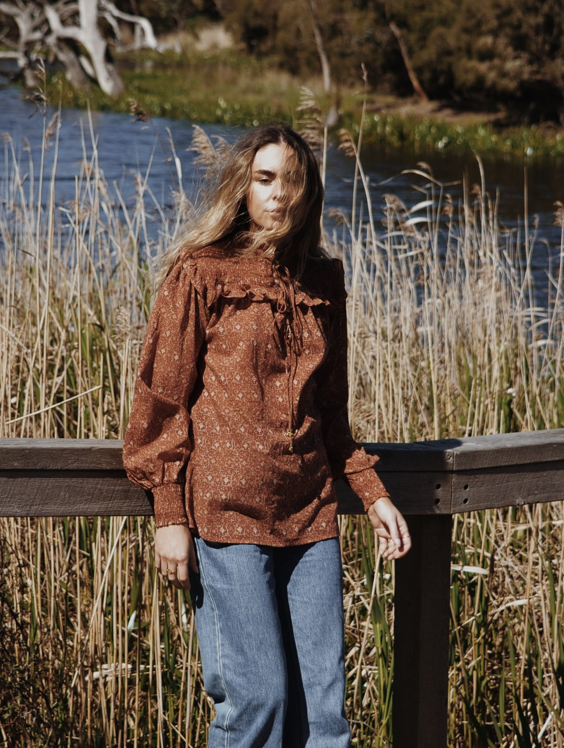 100% cotton. A blouse made for light and carefree days spent slowly outside in the garden. Modernised Edwardian, a beautifully floaty style that can be worn casually with your favourite jeans, or also has a slightly dressier edge in it's frill detailing. The shirred yoke can be worn open casually or as a high neck, making it also ideal for feeding. To get the ultimate wear out of your blouse, you can also flip in around to a closed high neck look too as seen in photos.