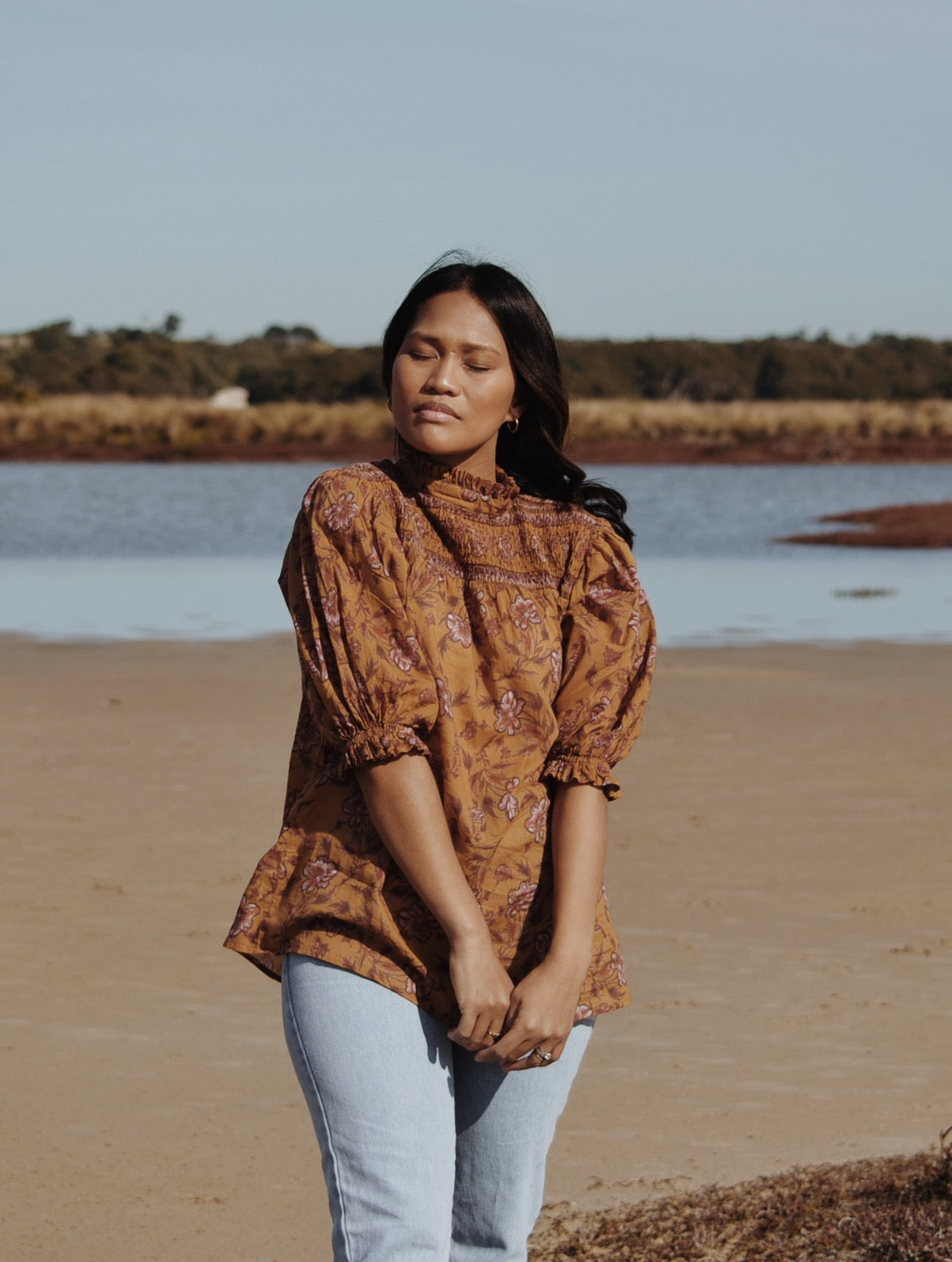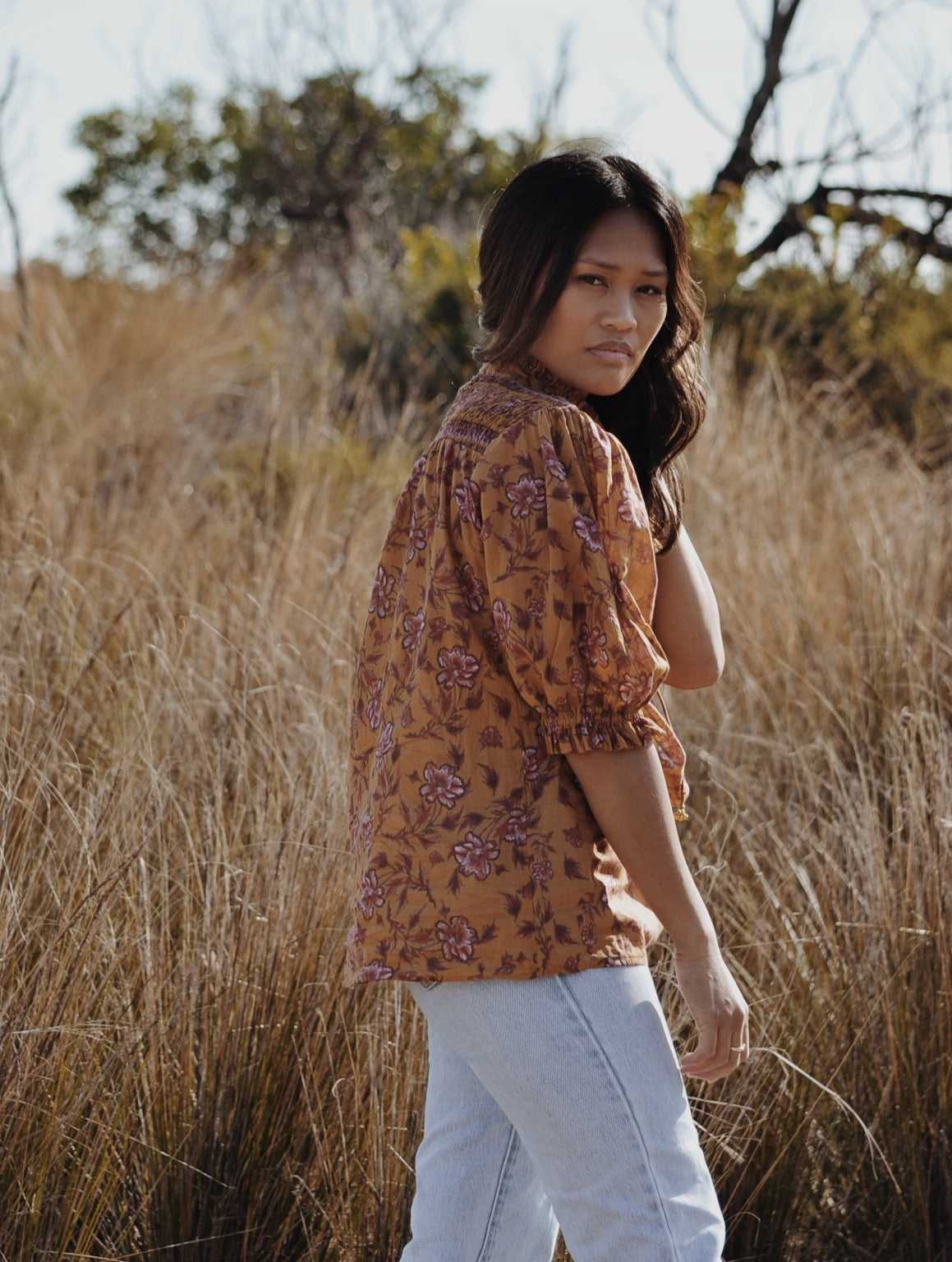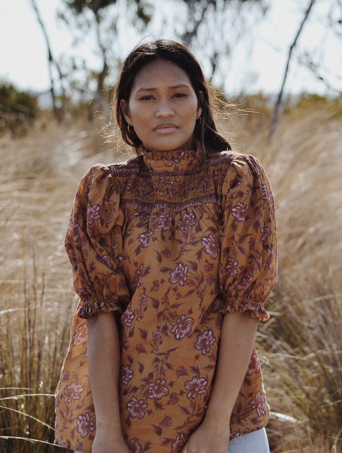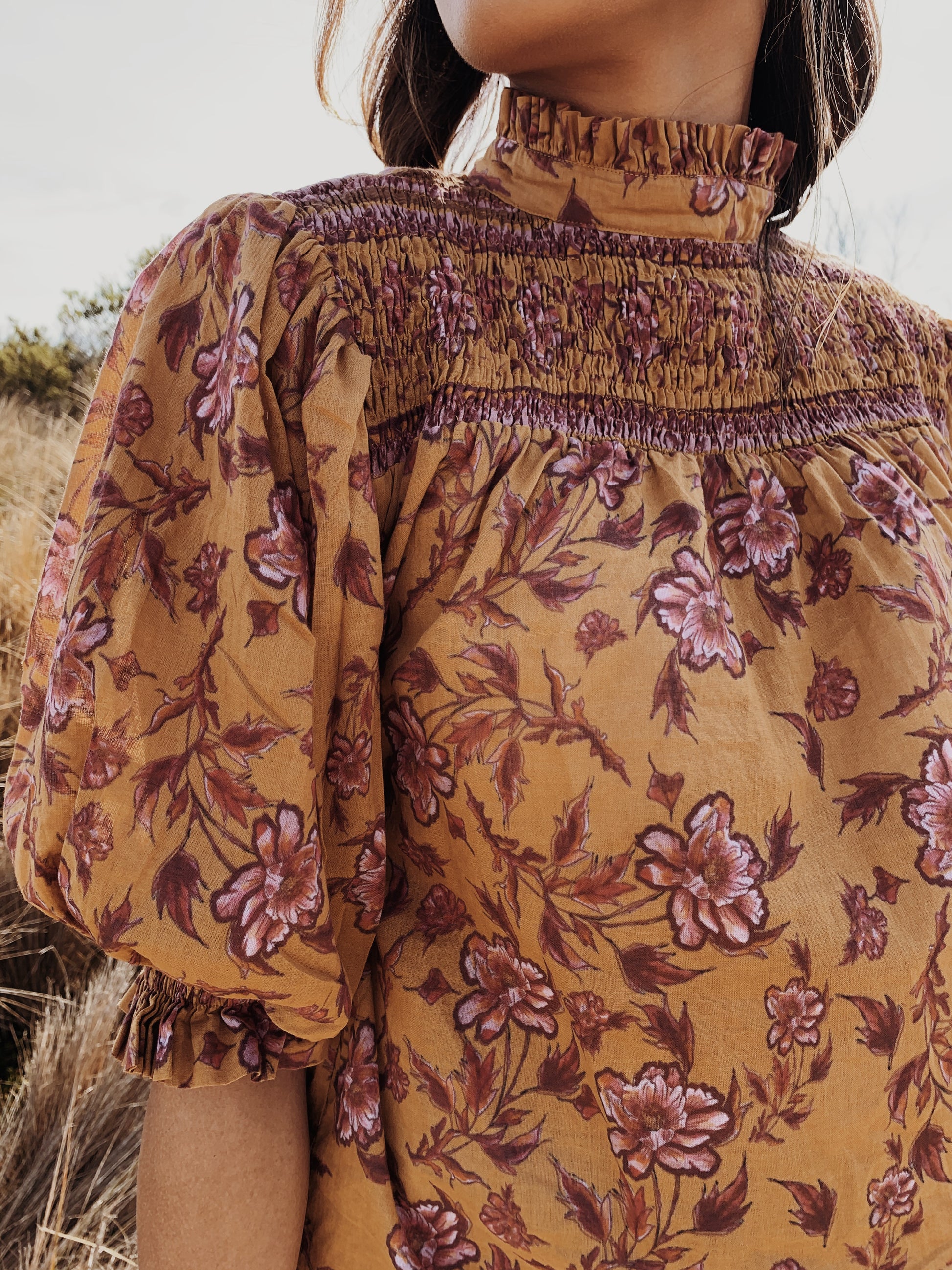 100% cotton. Elegantly bohemian, a beautifully floaty style that can be worn casually with your favourite jeans, or also has a slightly dressier edge in it's detailing, perfect for easy layering. The combination of the custom painted floral and styling, with a touch of Victorian, make for Bohemian Beauty meets Country Manor. The shirred yoke can be worn open casually or as a high neck, making it also ideal for feeding. To get the ultimate wear out of your blouse, you can also wear it back to front for a closed look too.
