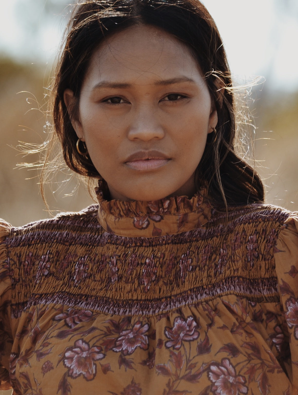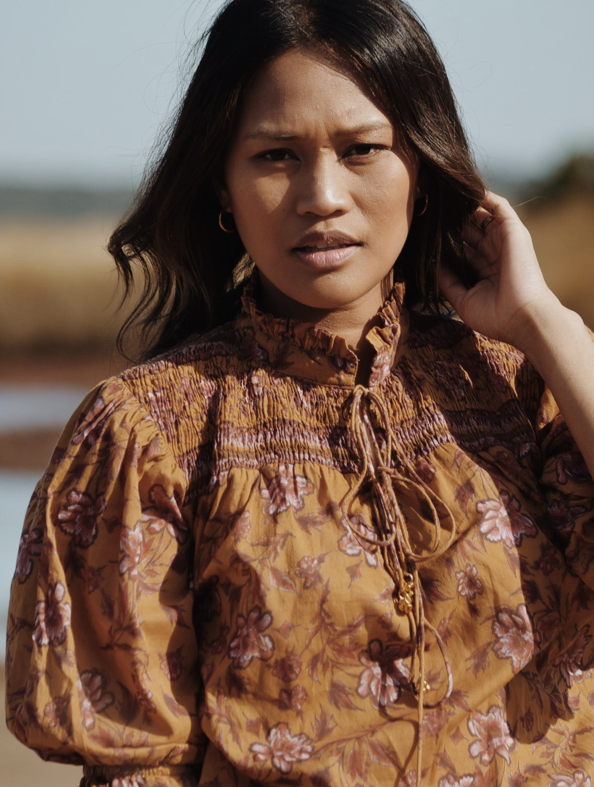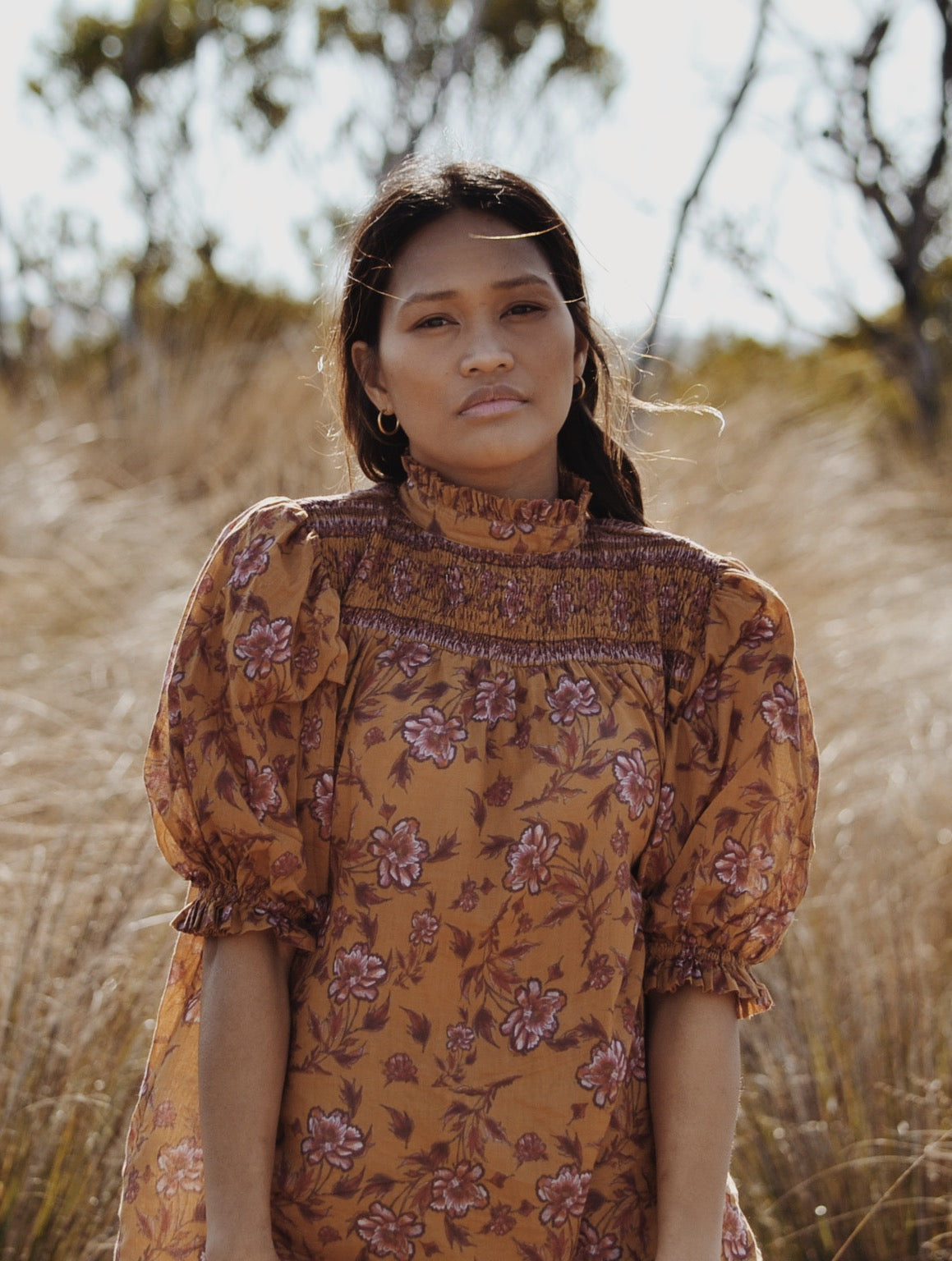 100% cotton. Elegantly bohemian, a beautifully floaty style that can be worn casually with your favourite jeans, or also has a slightly dressier edge in it's detailing, perfect for easy layering. The combination of the custom painted floral and styling, with a touch of Victorian, make for Bohemian Beauty meets Country Manor. The shirred yoke can be worn open casually or as a high neck, making it also ideal for feeding. To get the ultimate wear out of your blouse, you can also wear it back to front for a closed look too.