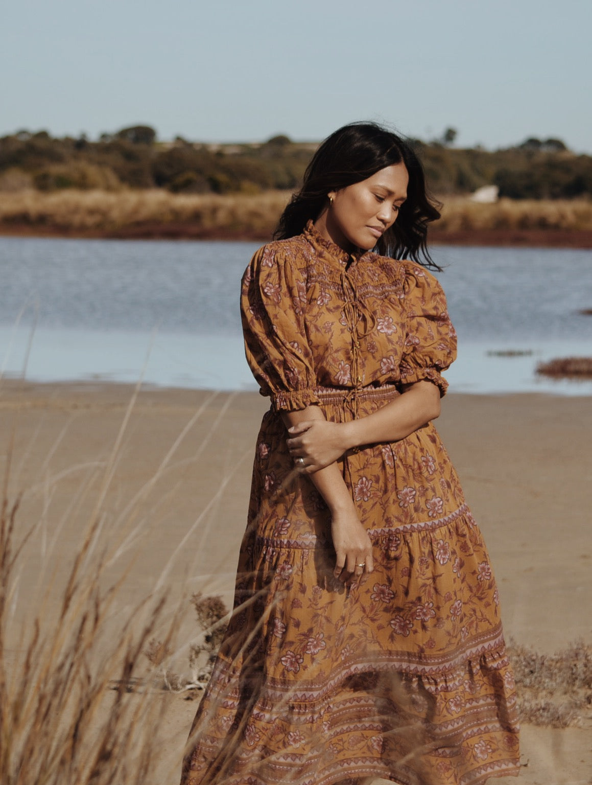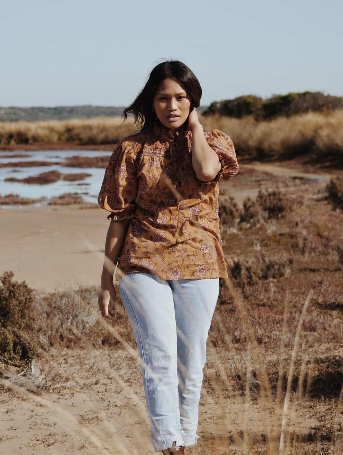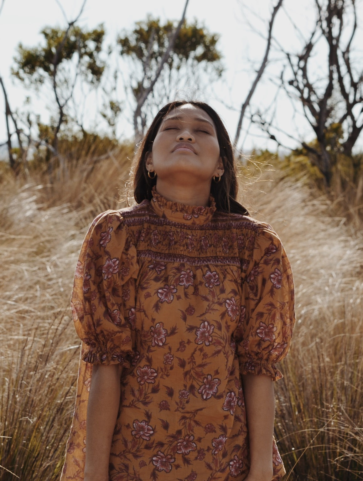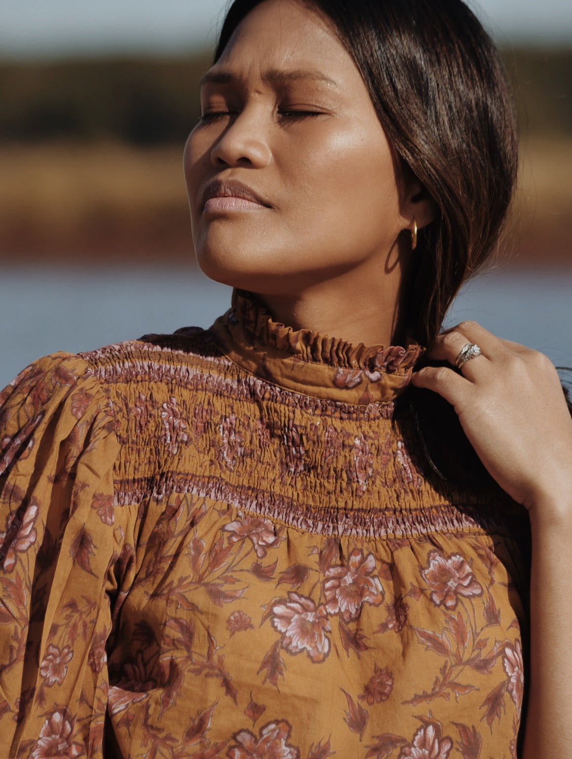100% cotton. Elegantly bohemian, a beautifully floaty style that can be worn casually with your favourite jeans, or also has a slightly dressier edge in it's detailing, perfect for easy layering. The combination of the custom painted floral and styling, with a touch of Victorian, make for Bohemian Beauty meets Country Manor. The shirred yoke can be worn open casually or as a high neck, making it also ideal for feeding. To get the ultimate wear out of your blouse, you can also wear it back to front for a closed look too.