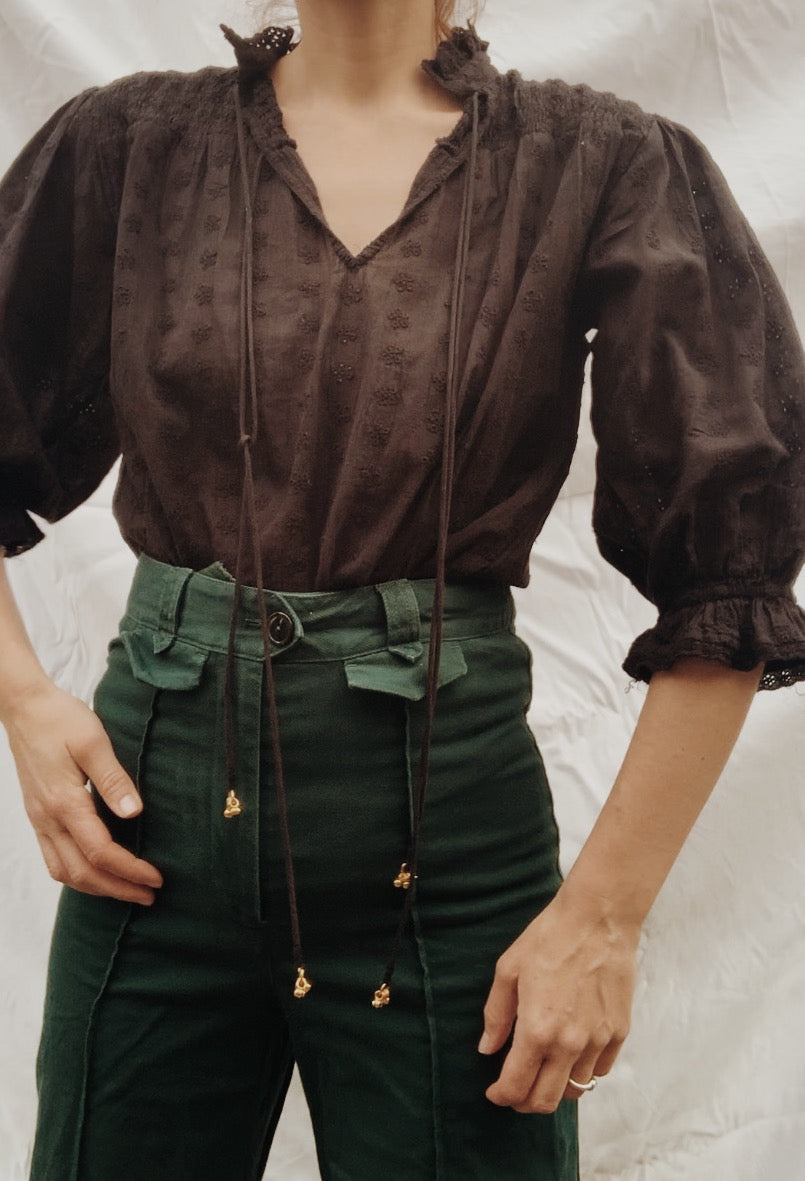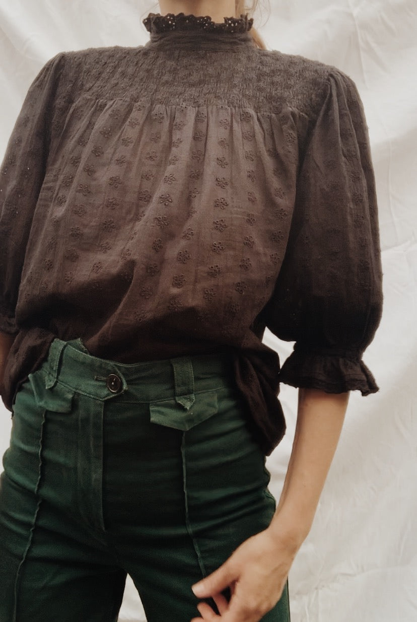 100% cotton. A blouse made for light and carefree days spent slowly outside in the garden. Modernised Edwardian, a beautifully floaty style that can be worn casually with your favourite jeans, or also has a slightly dressier edge in it's cotton lace detailing. The shirred yoke can be worn open casually or as a high neck, making it also ideal for feeding. To get the ultimate wear out of your blouse, you can also wear it back to front for a closed look too as seen in photos.