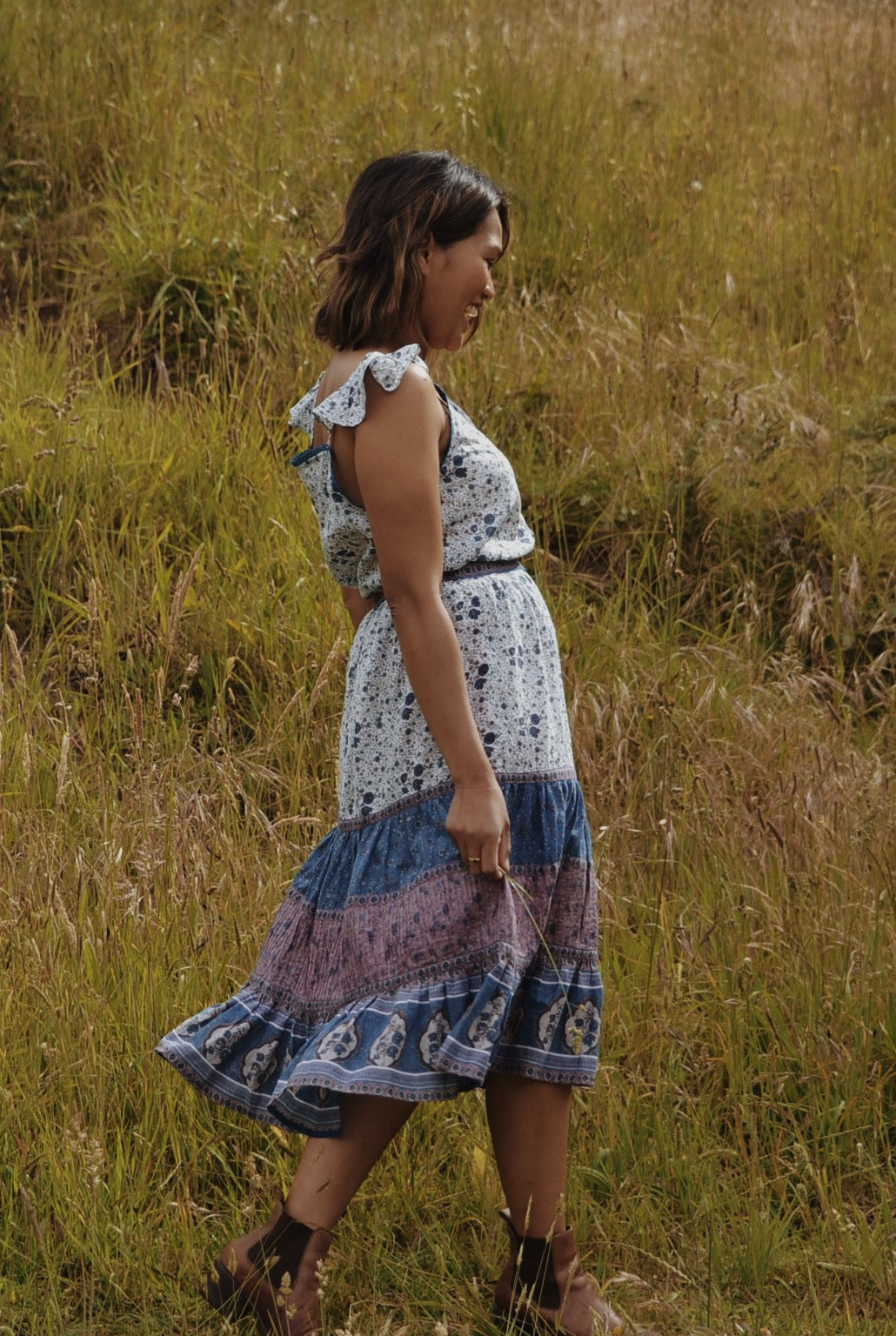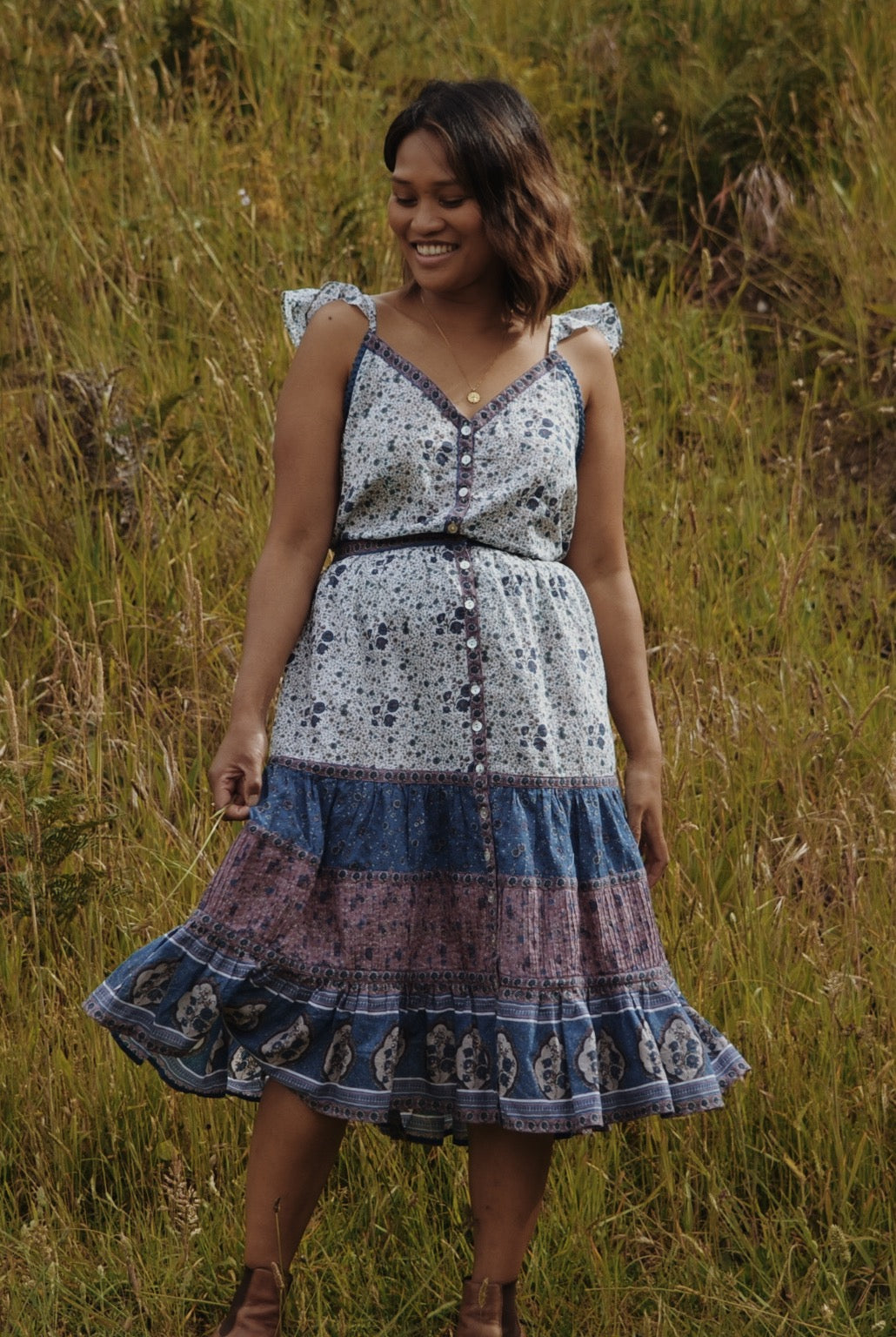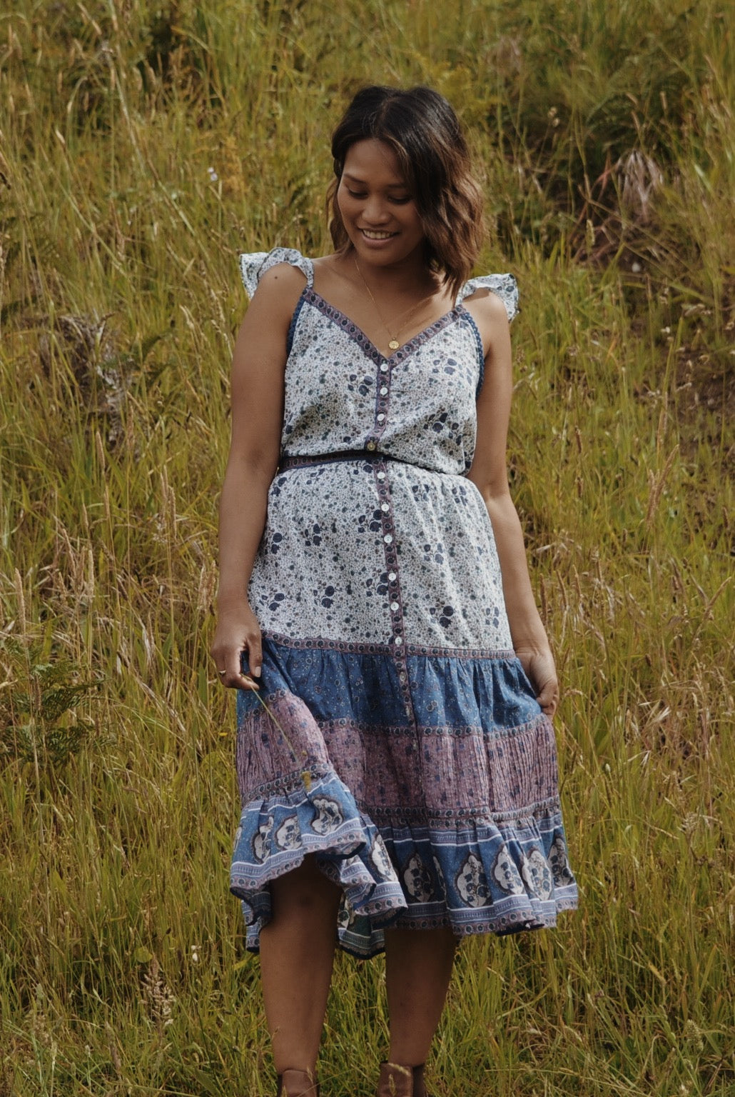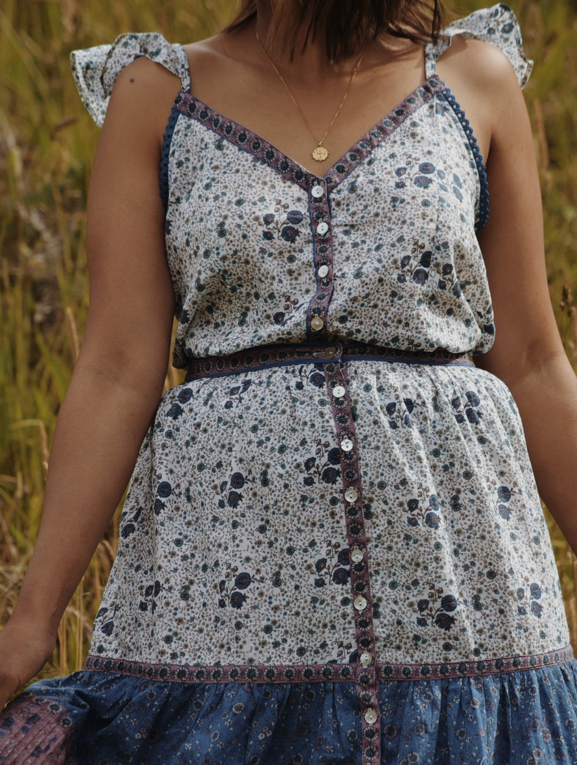 100% cotton. Made for slow breezy, balmy afternoons spent outside, sitting under the shade of big old trees, drinking home made iced tea to cool down. This style is wonderfully versatile and can be worn as a dress when paired with the Marais skirt or worn individually with another skirt or jeans. Made in a custom ANKOA print with a wonderfully bohemian feel. The button through front makes for easy breastfeeding. Beautifully feminine with gathering along shoestring straps.