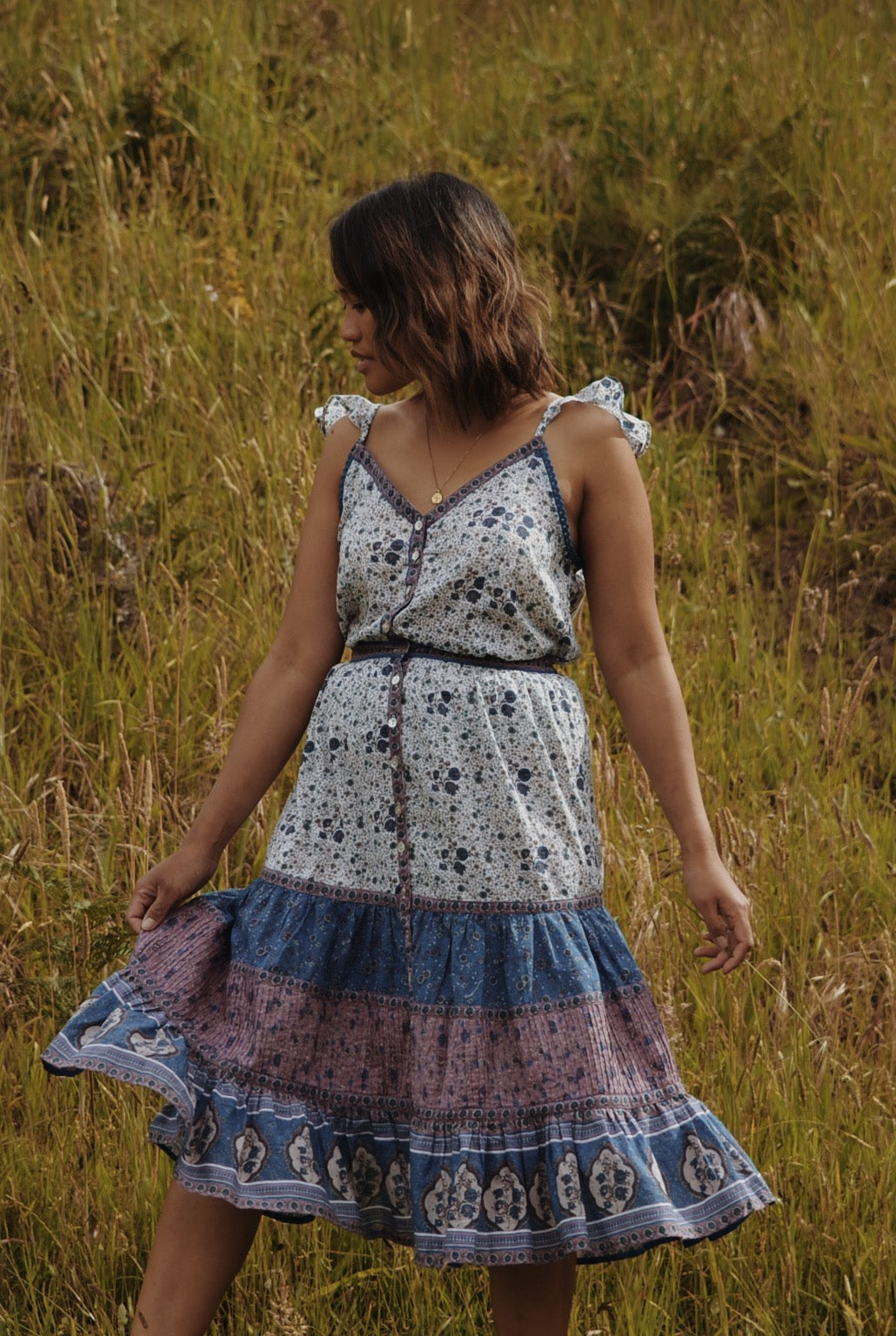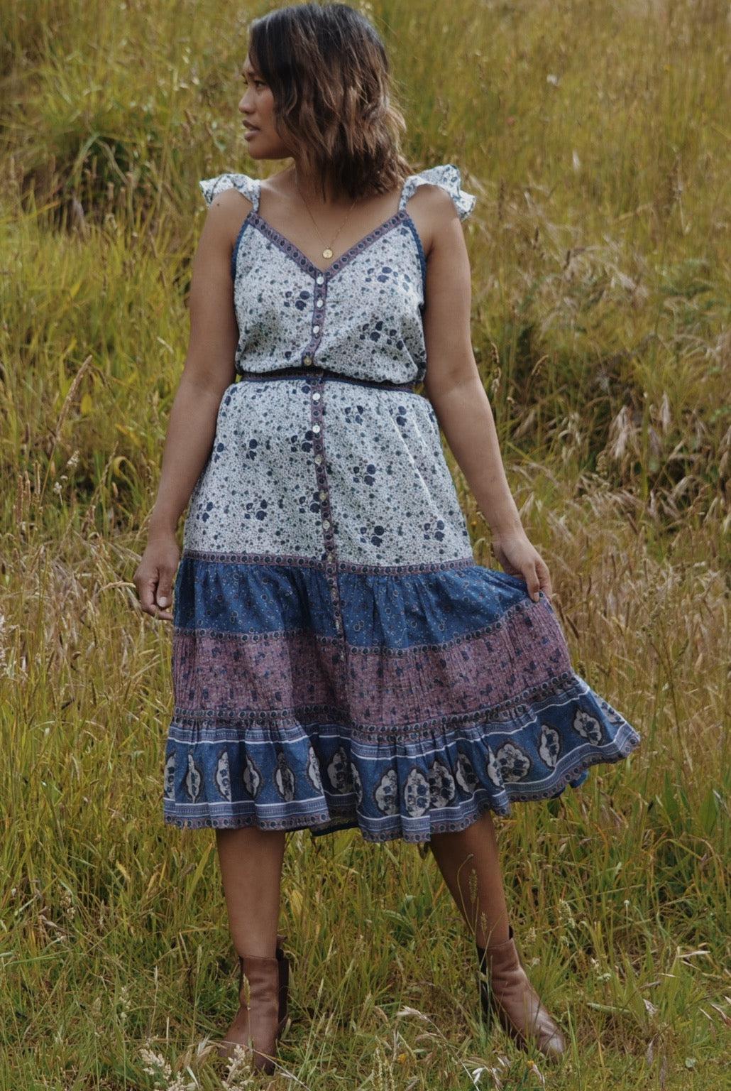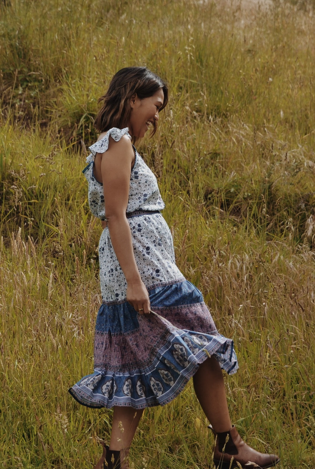 100% cotton. Made for slow breezy, balmy afternoons spent outside, sitting under the shade of big old trees, drinking home made iced tea to cool down. This style is wonderfully versatile and can be worn as a dress when paired with the Marais skirt or worn individually with another skirt or jeans. Made in a custom ANKOA print with a wonderfully bohemian feel. The button through front makes for easy breastfeeding. Beautifully feminine with gathering along shoestring straps.