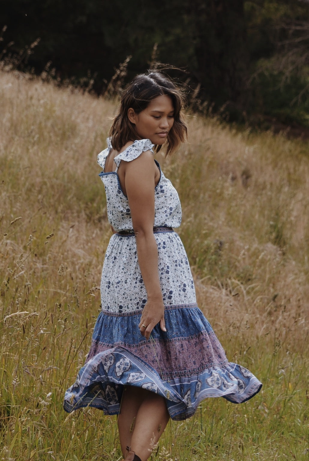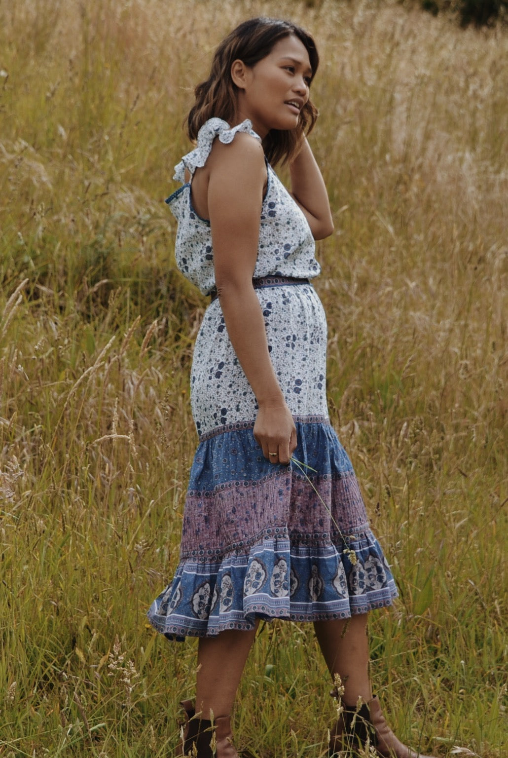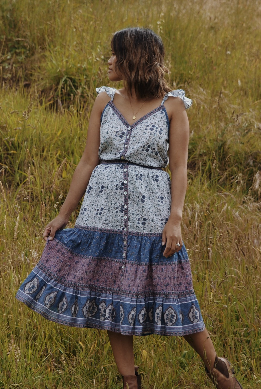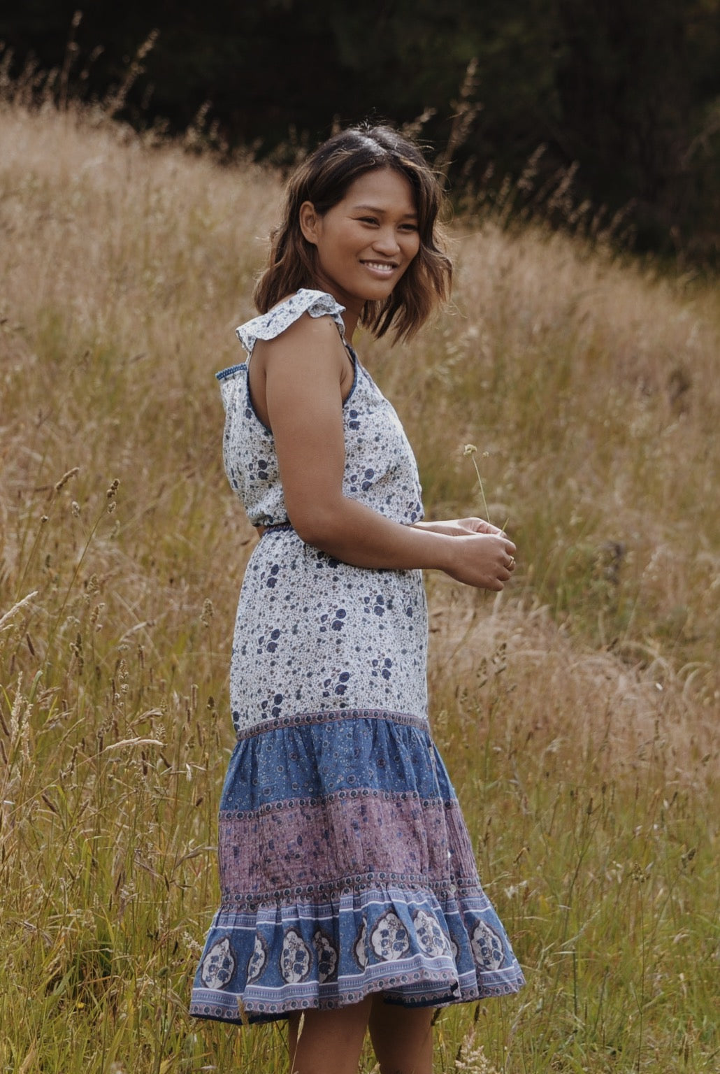 100% cotton. Made for slow breezy, balmy afternoons spent outside, sitting under the shade of big old trees, drinking home made iced tea to cool down. This style is wonderfully versatile and can be worn as a dress when paired with the Marais skirt or worn individually with another skirt or jeans. Made in a custom ANKOA print with a wonderfully bohemian feel. The button through front makes for easy breastfeeding. Beautifully feminine with gathering along shoestring straps.