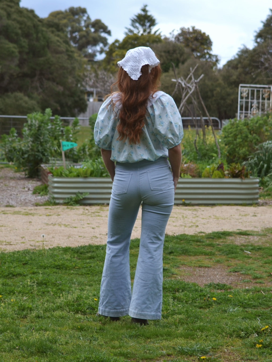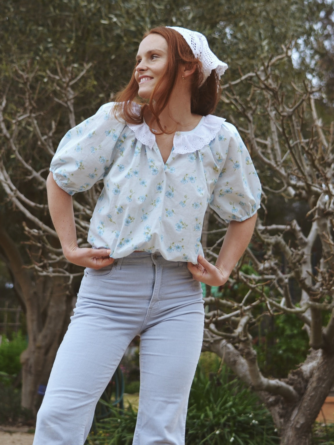 REWORKED - ONE OF A KIND SMOCK CROP BLOUSE BLUE FLORAL EXTRA SMALL
