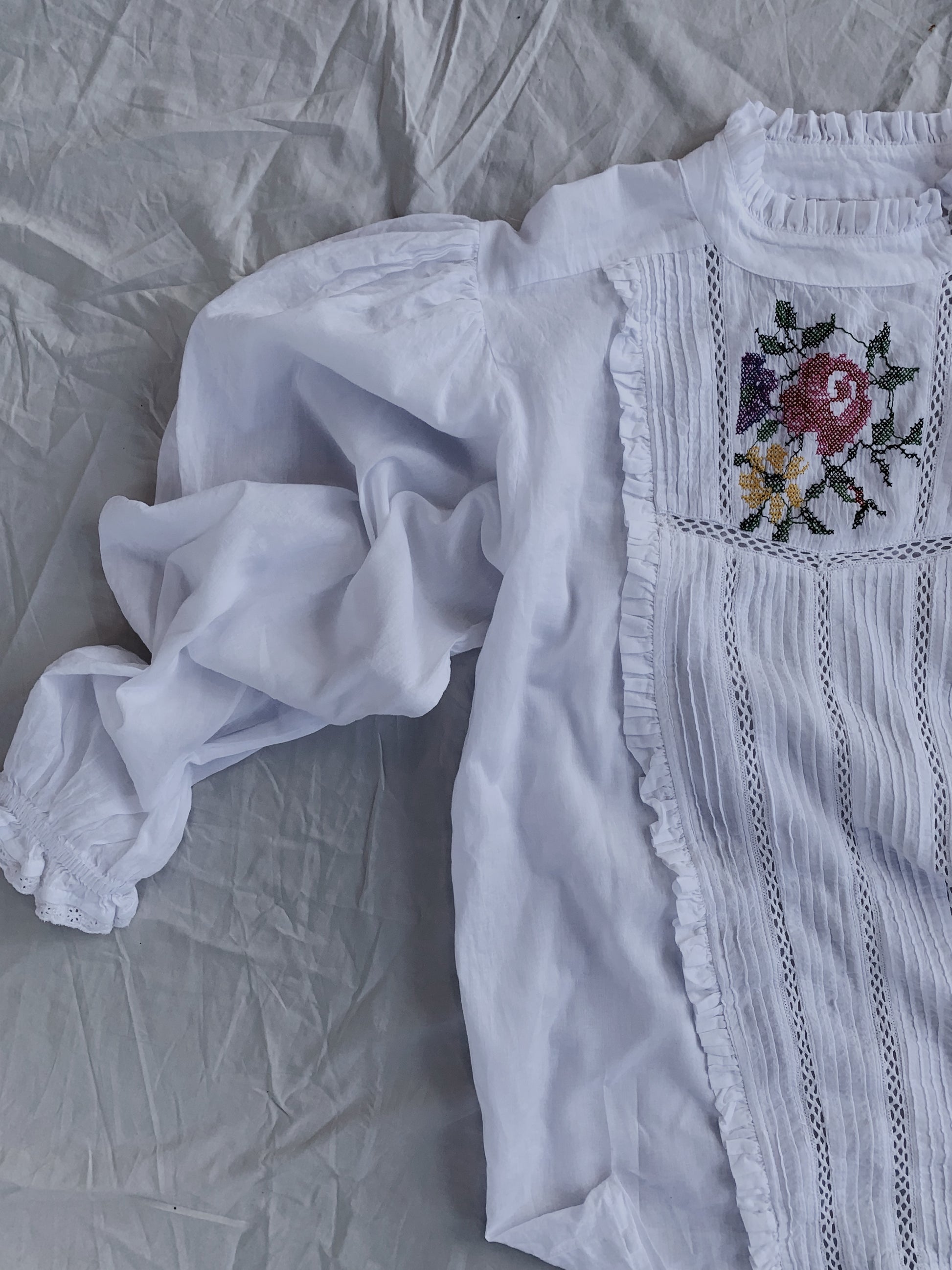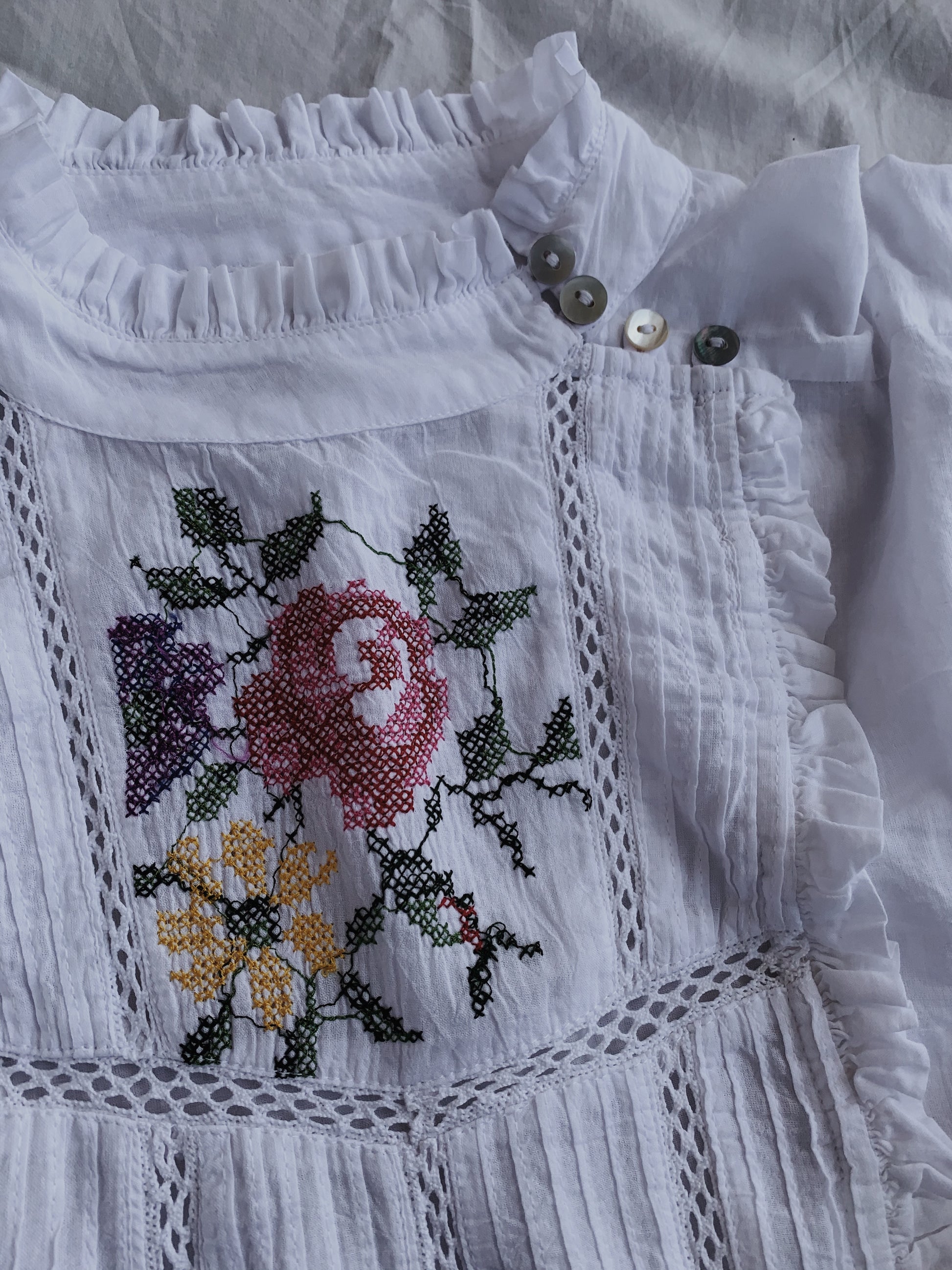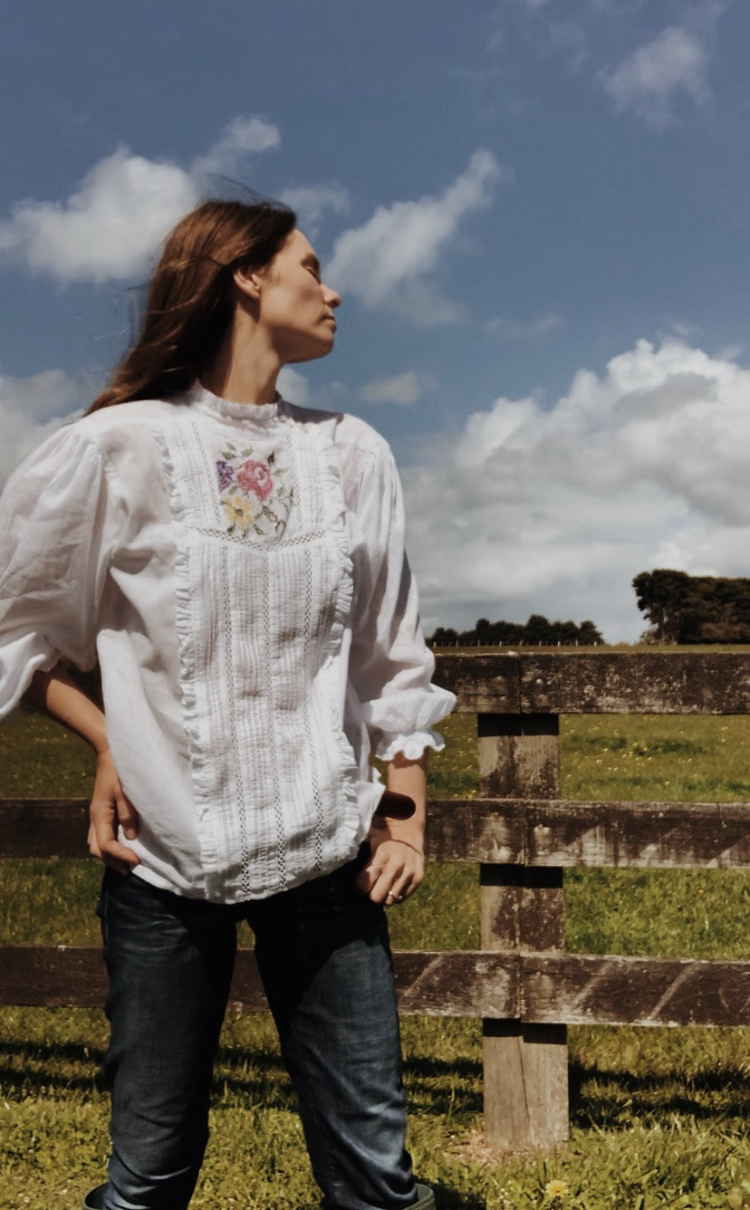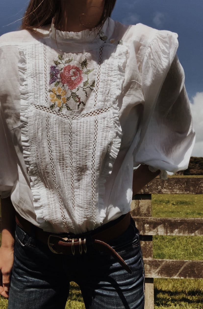 100% cotton. A classic blouse you will treasure, made for slow, sunny days spent wandering in a reverie. This beauty will take you to a time and place far away. Little nods to nostalgia include the Edwardian inspired high neckline with gathers, lace detailing, pintucks and a cross stitch embroidered feature.