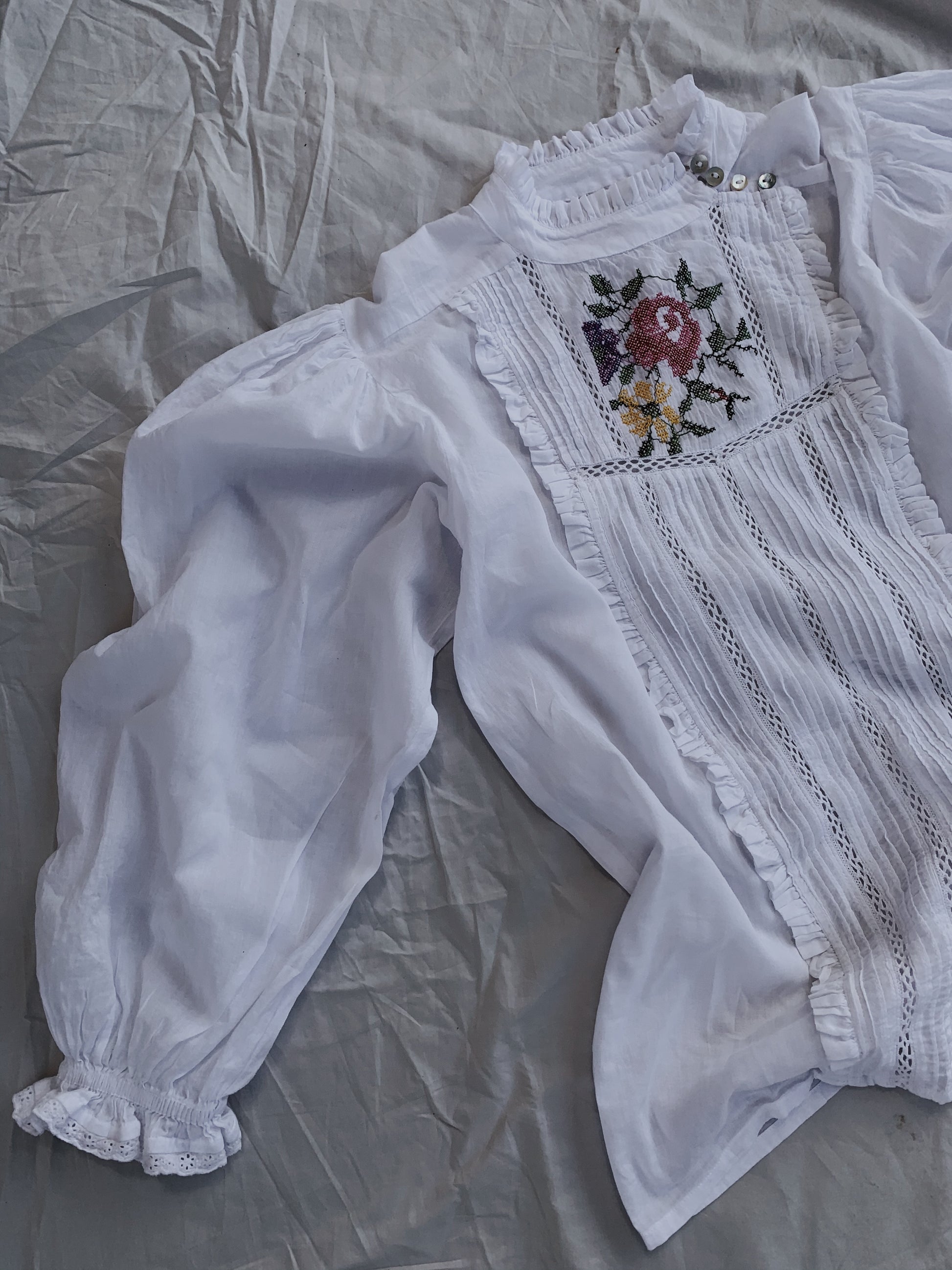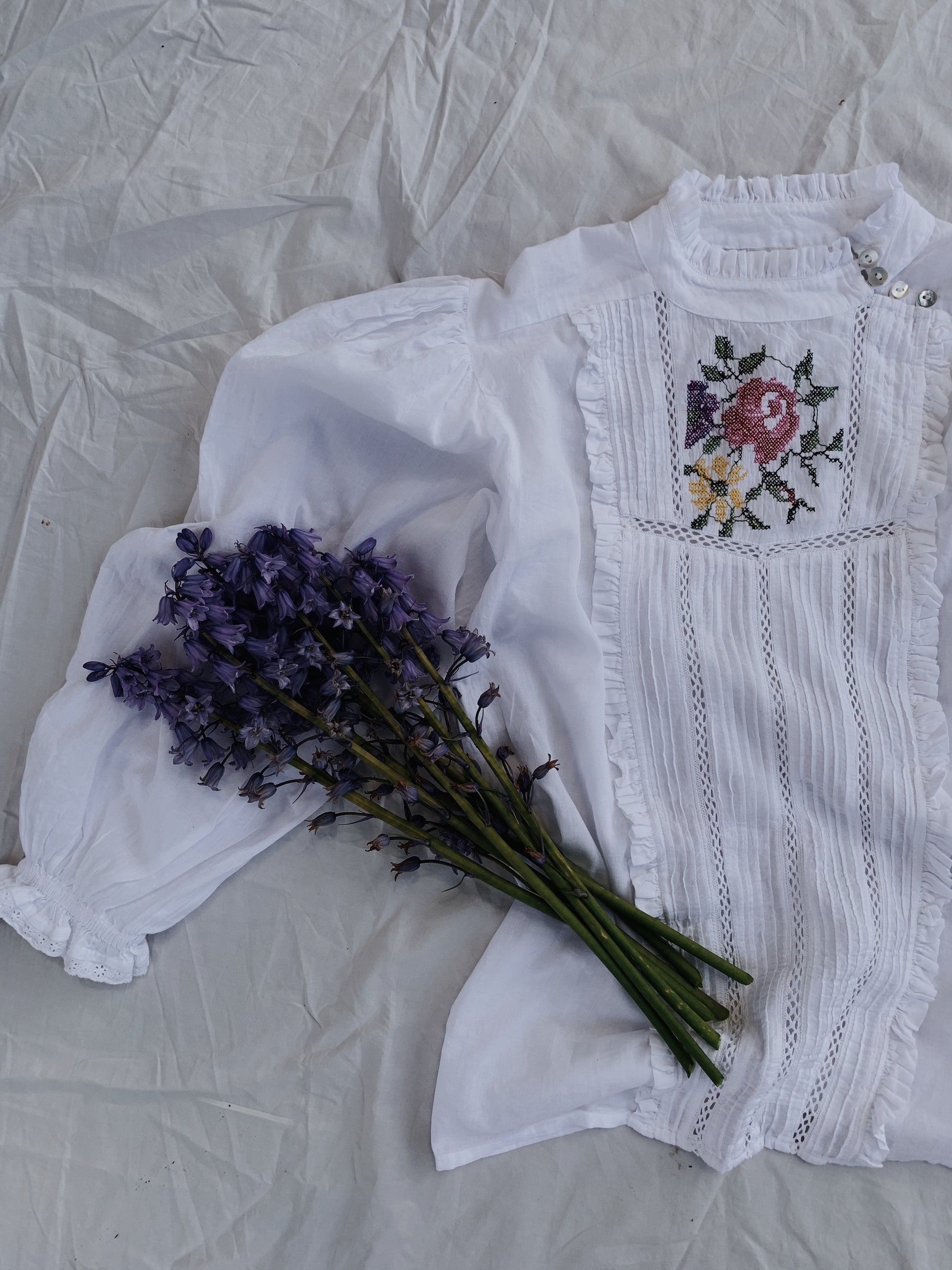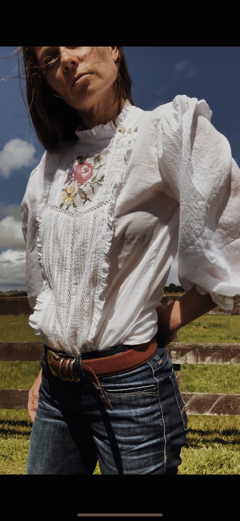 100% cotton. A classic blouse you will treasure, made for slow, sunny days spent wandering in a reverie. This beauty will take you to a time and place far away. Little nods to nostalgia include the Edwardian inspired high neckline with gathers, lace detailing, pintucks and a cross stitch embroidered feature.