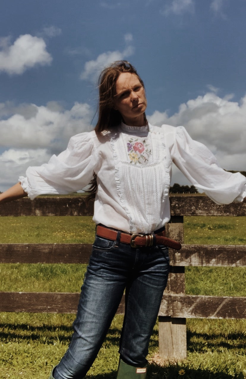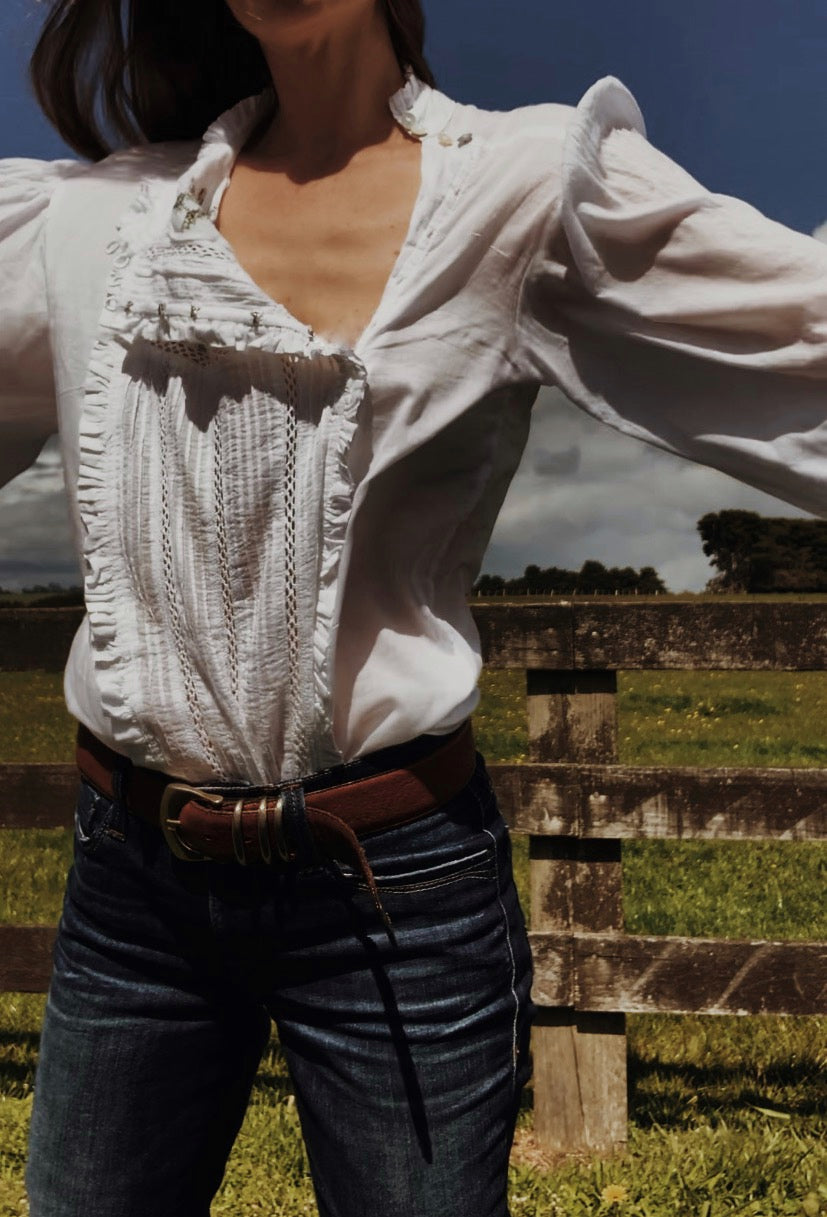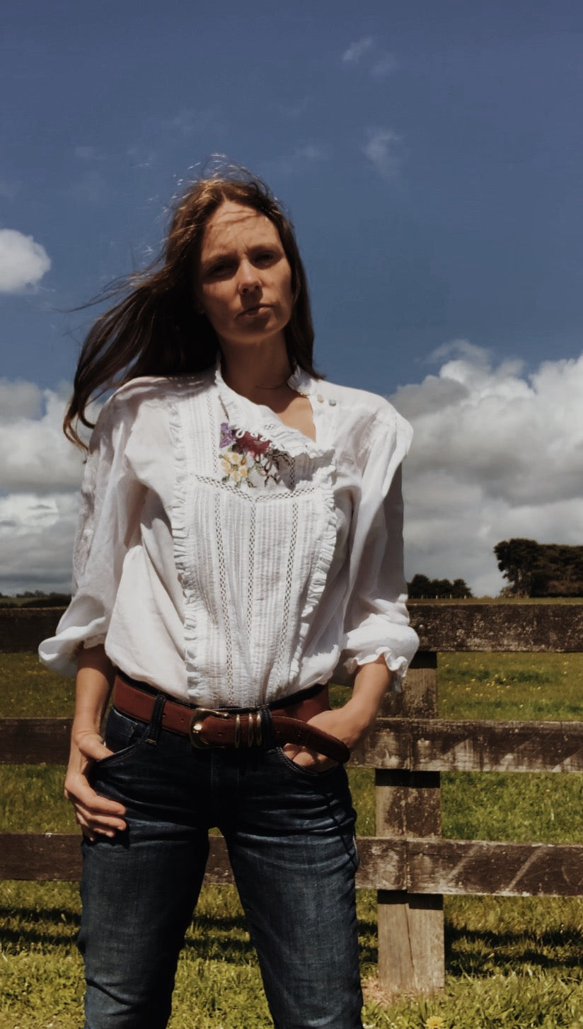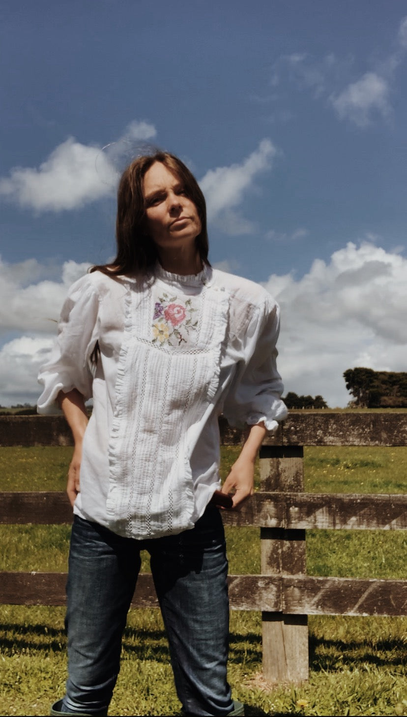 100% cotton. A classic blouse you will treasure, made for slow, sunny days spent wandering in a reverie. This beauty will take you to a time and place far away. Little nods to nostalgia include the Edwardian inspired high neckline with gathers, lace detailing, pintucks and a cross stitch embroidered feature.