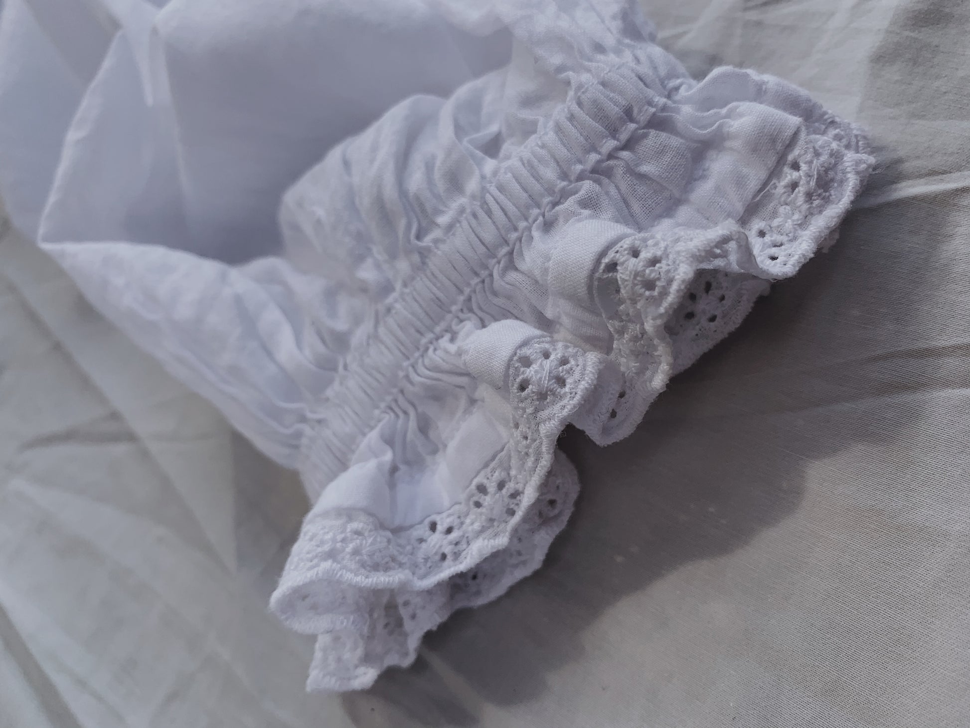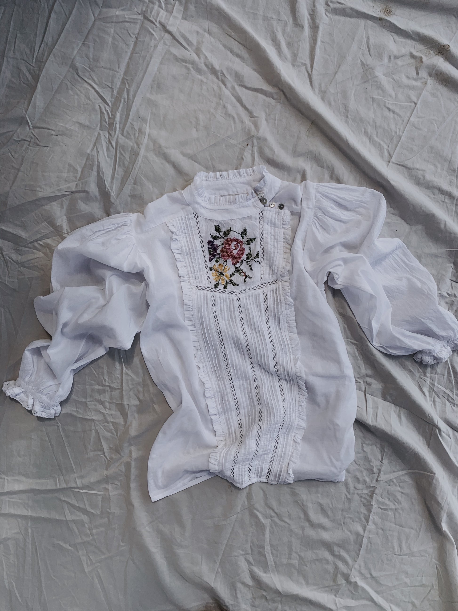 Beautifully soft cotton make it light to wear, giving it a lovely antique feel. The puffed sleeves have an elastic cuff which flares out to feature lace detailing.