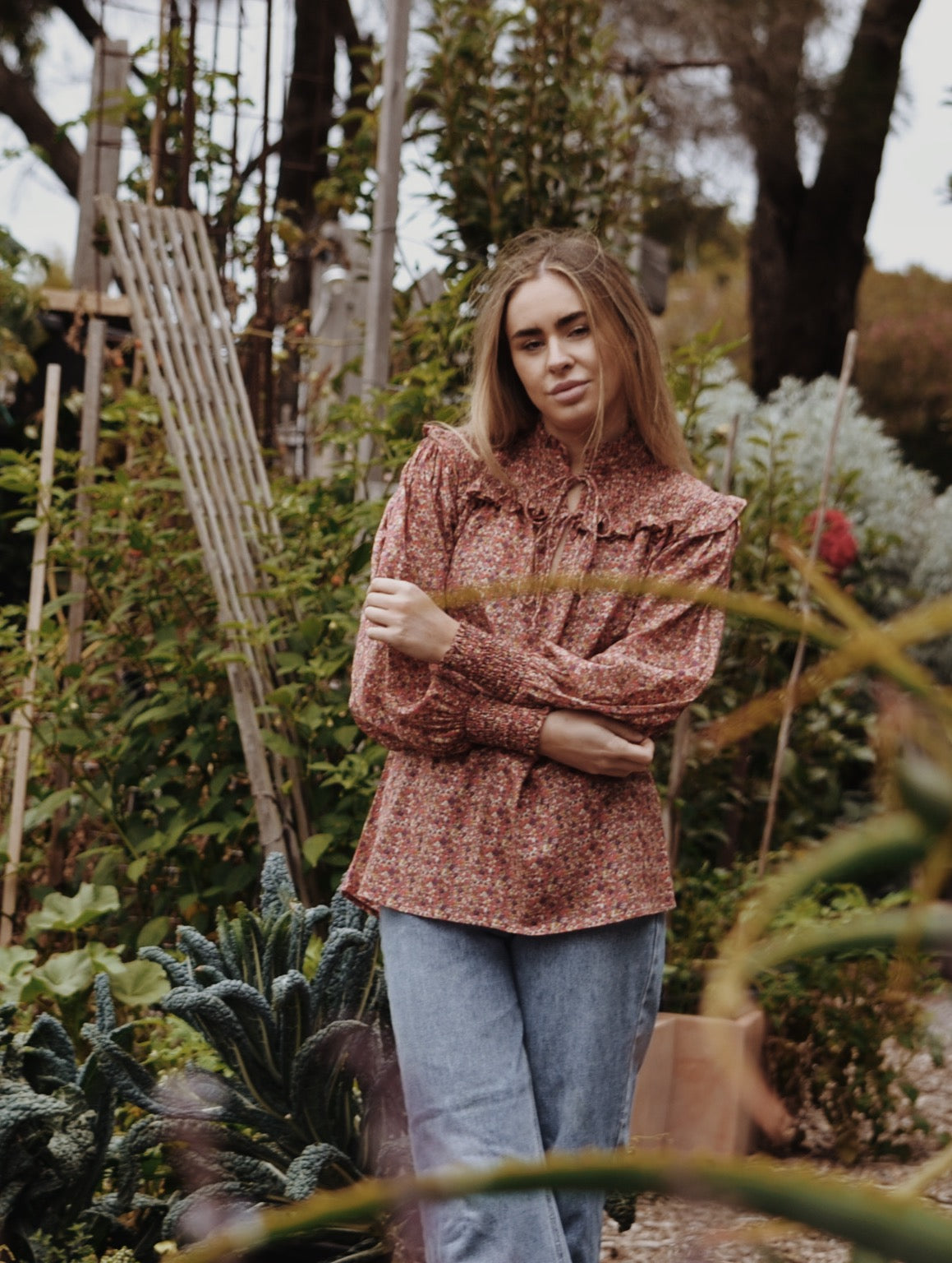 100% cotton. A blouse made for light and carefree days spent slowly outside in the garden. Modernised Edwardian, a beautifully floaty style that can be worn casually with your favourite jeans, or also has a slightly dressier edge in it's frill detailing. The shirred yoke can be worn open casually or as a high neck, making it also ideal for feeding. To get the ultimate wear out of your blouse, you can also flip in around to a closed high neck look too as seen in photos.